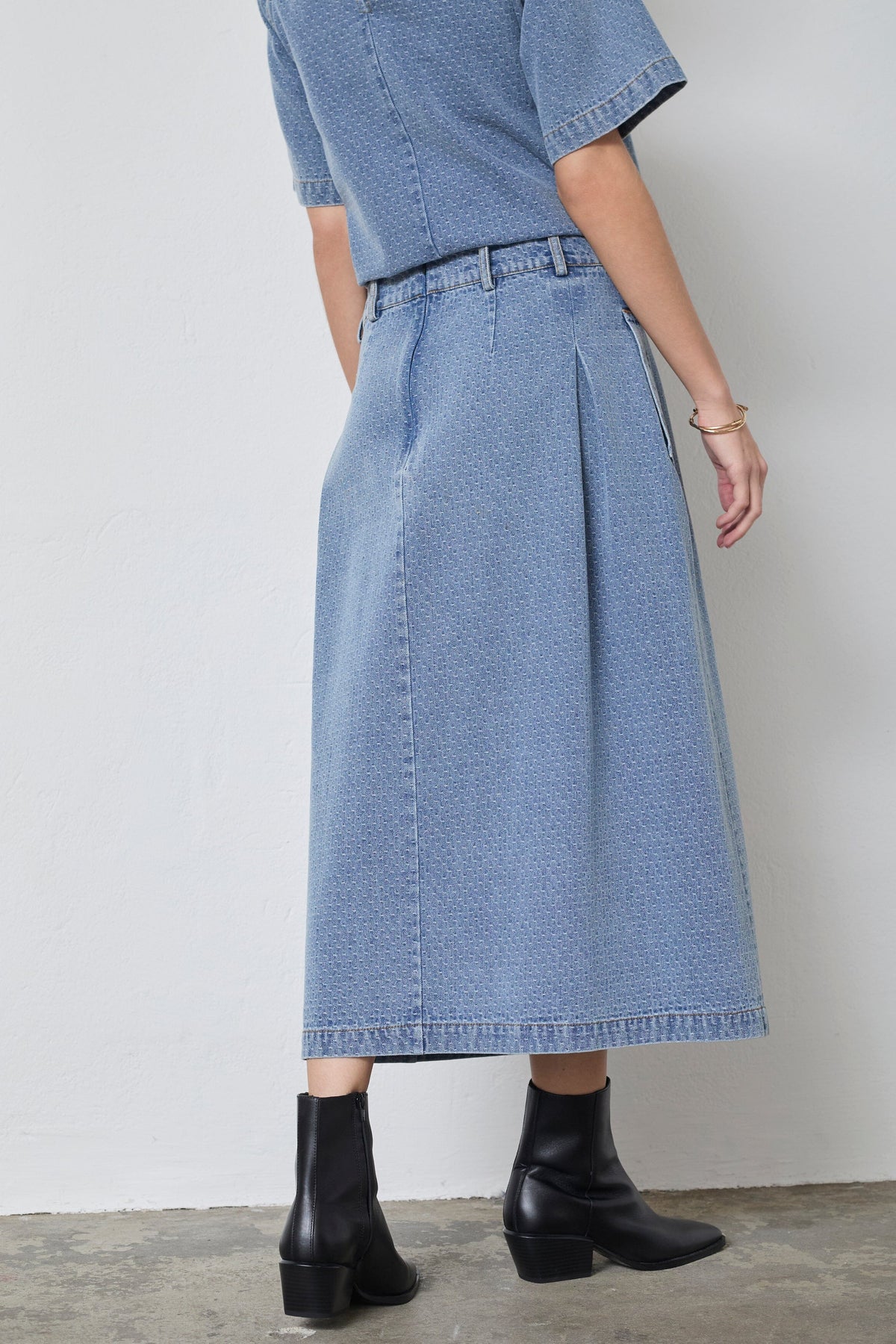 Plisseret nederdel fra Co´Couture i blå denim. Nederdelen har tydelige folder foran og bagpå samt et bælte med stropper i taljen.