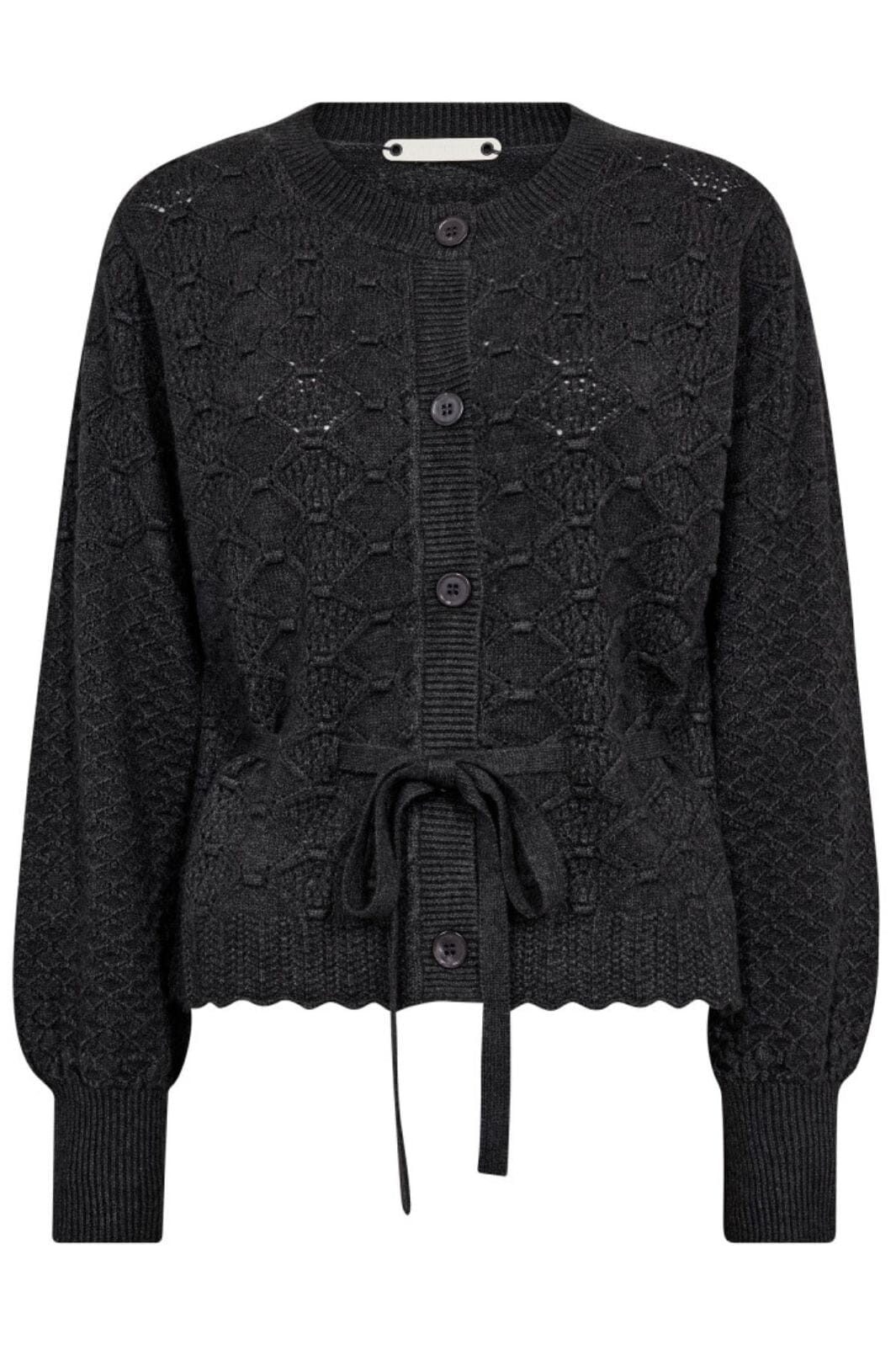 Mørkegrå cardigan fra Co'Couture med pointelle-mønster. Den har knapper foran og bindebånd i taljen. Ribstrikkede manchetter giver en god pasform ved håndleddene.