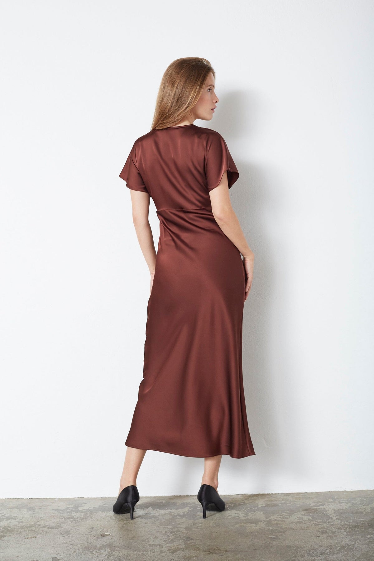 Mørkebrun kjole fra Co'Couture med V-udskæring og korte ærmer. Kjolen har en ankellang silhuet med flæsedetaljer og er velegnet til både bryllupper og andre festlige anledninger.