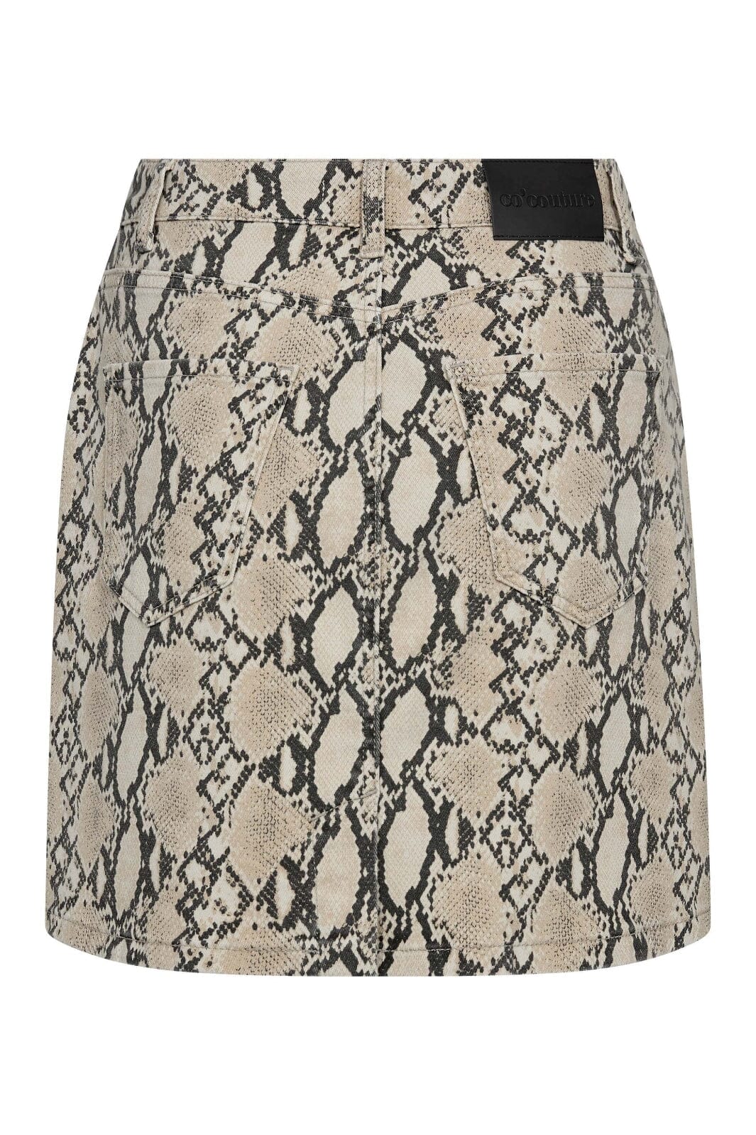 Denimnederdel fra Co'couture med slangeprint i beige og sort. Nederdelen har knapper foran og bæltestropper ved taljen samt to baglommer.