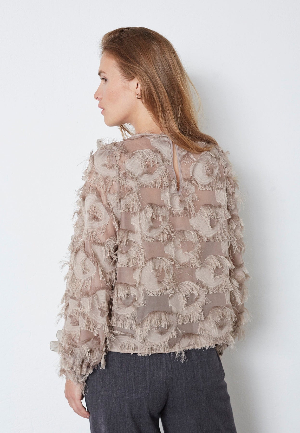 Brun bluse fra Co'Couture i valnødfarvet polyester. Blusen har en struktureret overflade med lag af ruflede detaljer og lange ærmer med rund halsudskæring.