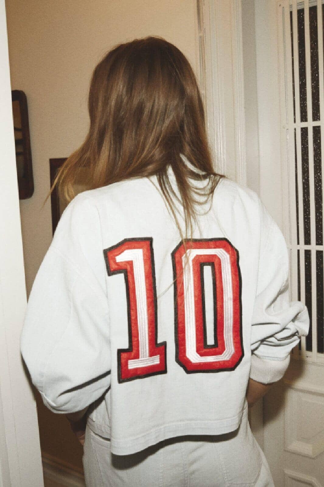 Denim bomberjakke fra Co´Couture i en lys, falmet denimfarve. Den korte model har et stort nummer 10 på ryggen i rød og hvid.