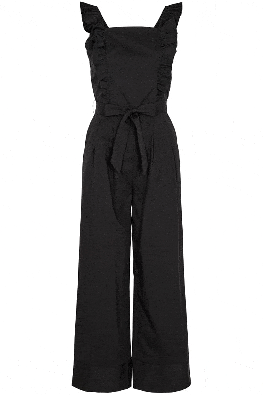 Smuk og smart jumpsuit fra Co'couture i sort. Der er fin flæse detalje og bindebånd til taljen samt forlommer.