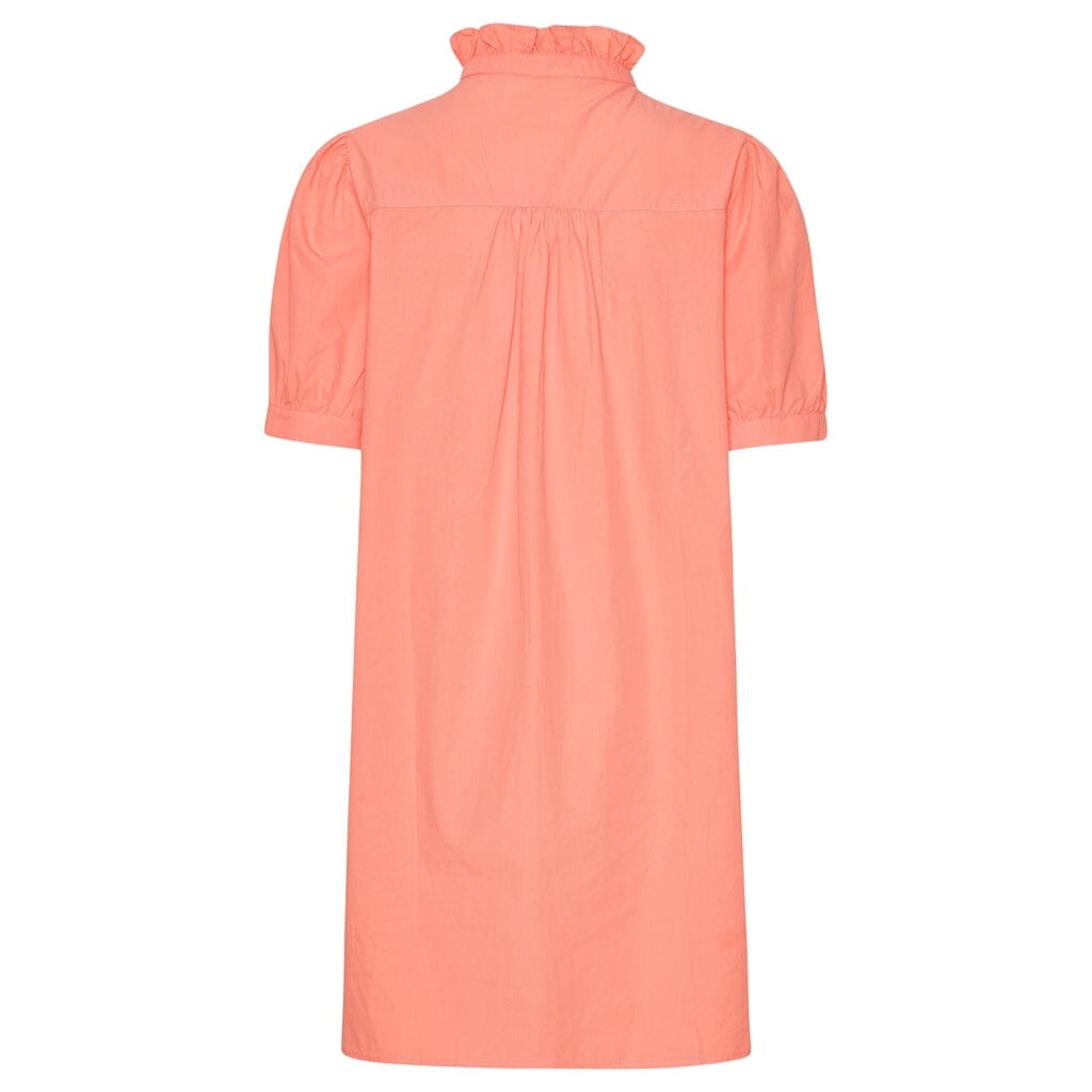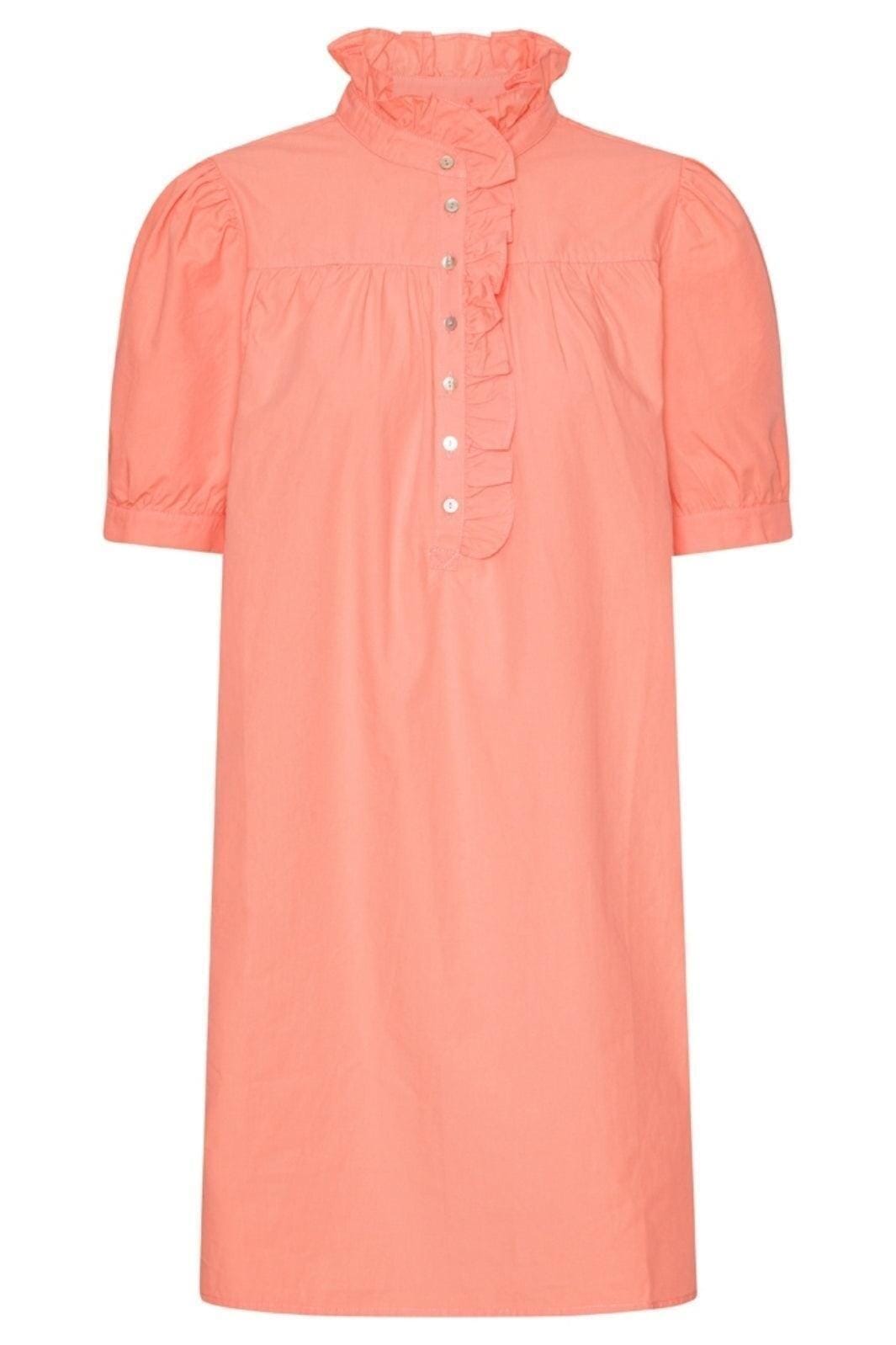 Denne Ariana Poplin-kjole fra Continue er en charmerende tilføjelse til garderoben, der udstråler en frisk og livlig charme med sin koralnuance.