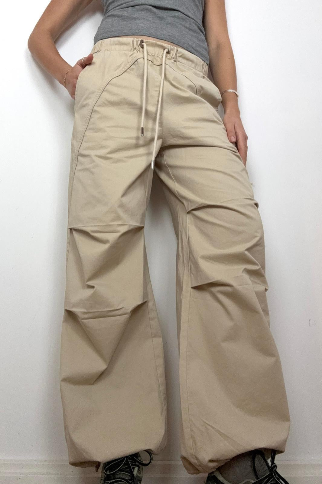 Brune bukser fra Continue med løs pasform og lange ben. Bukserne har en snøre og elastik i taljen samt dekorative syninger.