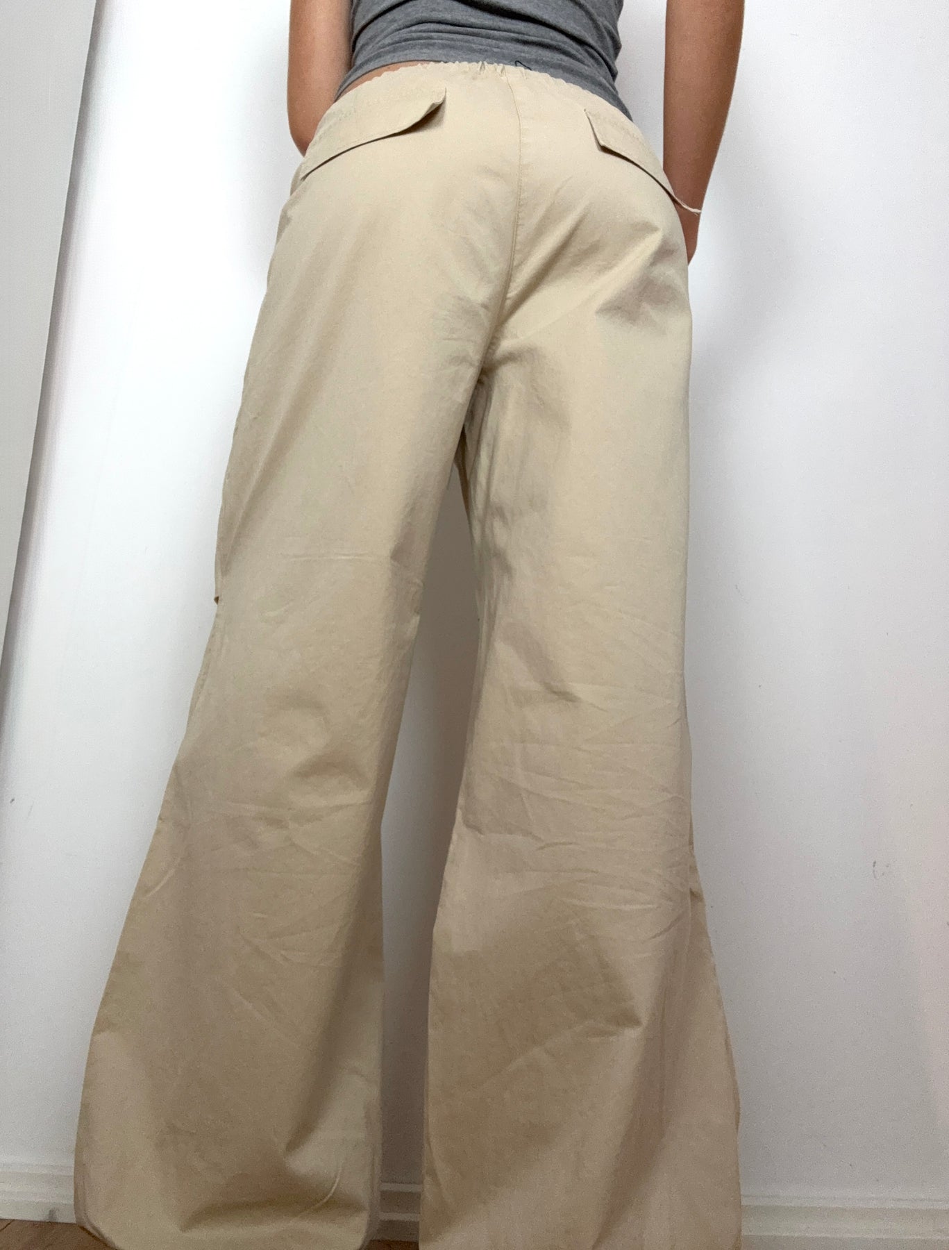 Beige bukser fra Continue i en sandfarvet nuance. Bukserne har en løs pasform med dekorative syninger og snøredetaljer i taljen.