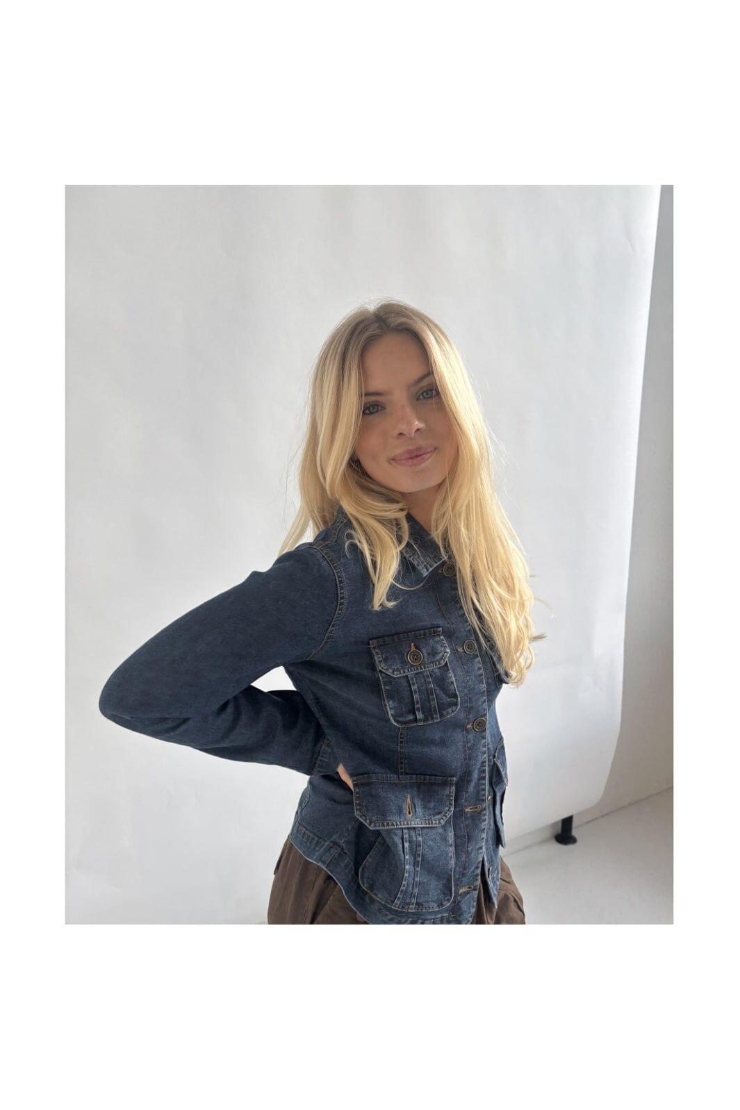 Denimjakke fra Continue i blå denim. Jakken har flere lommer på forsiden og en broderet detalje på ryggen.