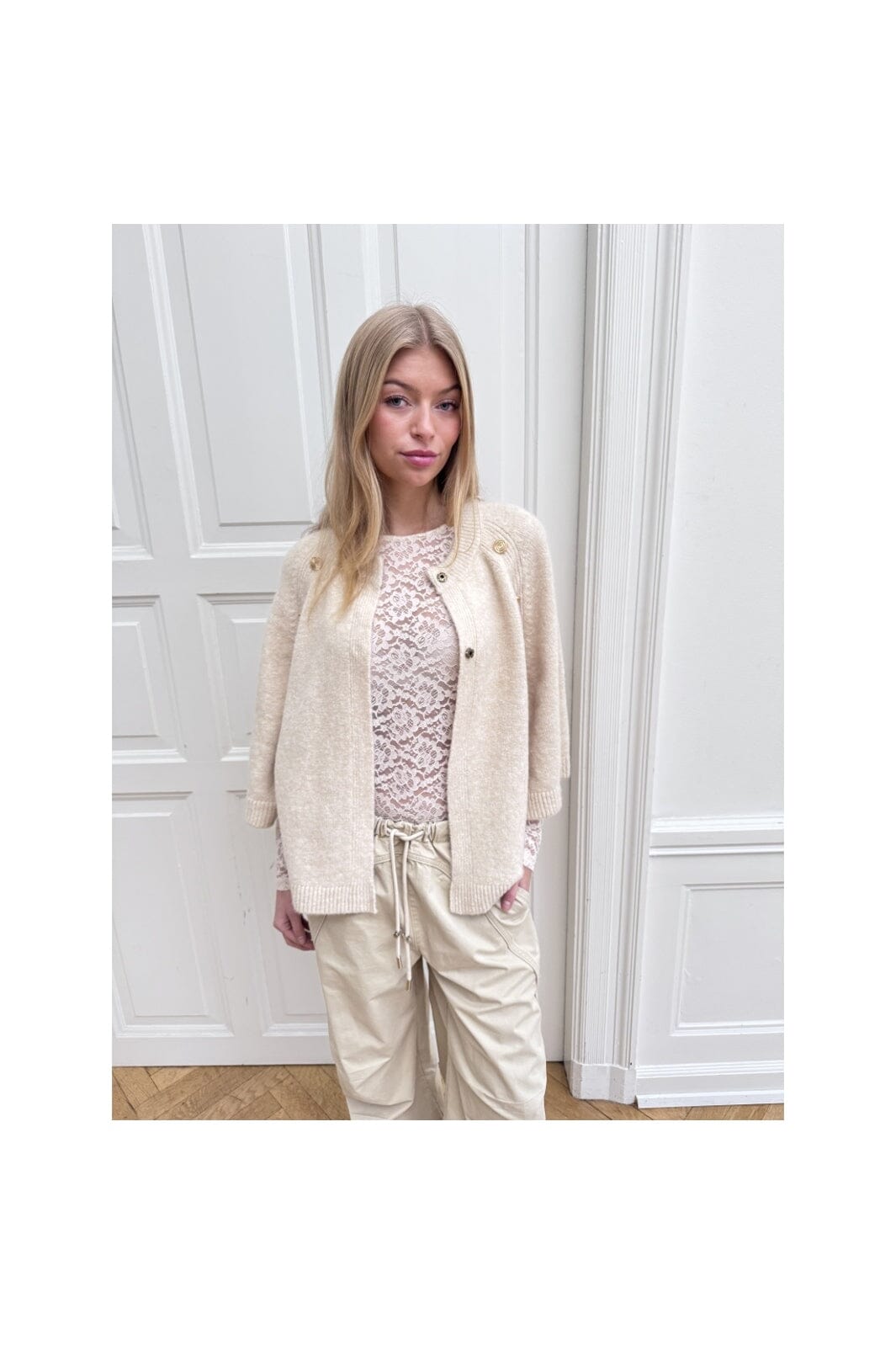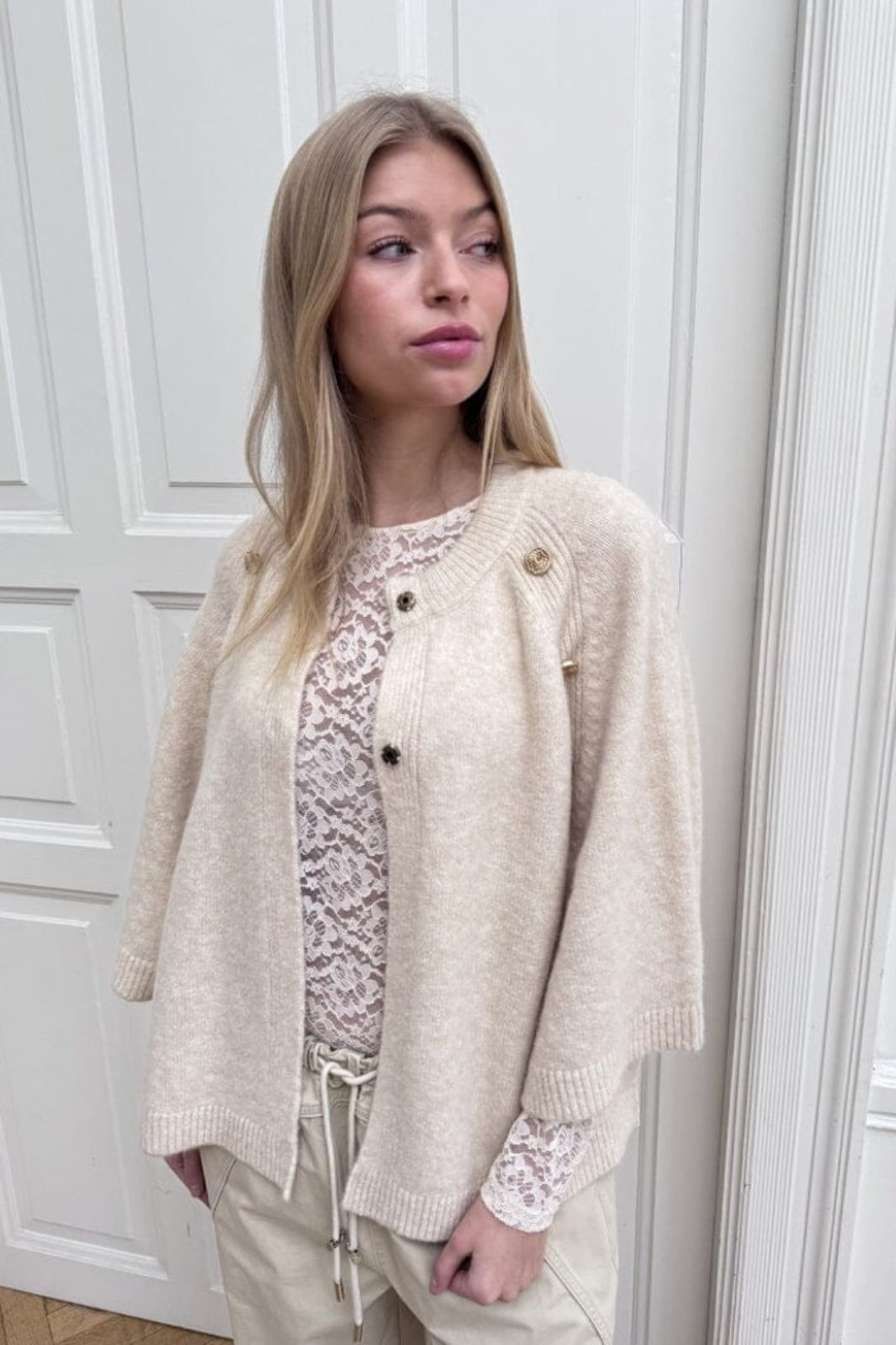 Cape fra Continue i en off-white farve. Den har en løs pasform og knapper ved skuldrene.