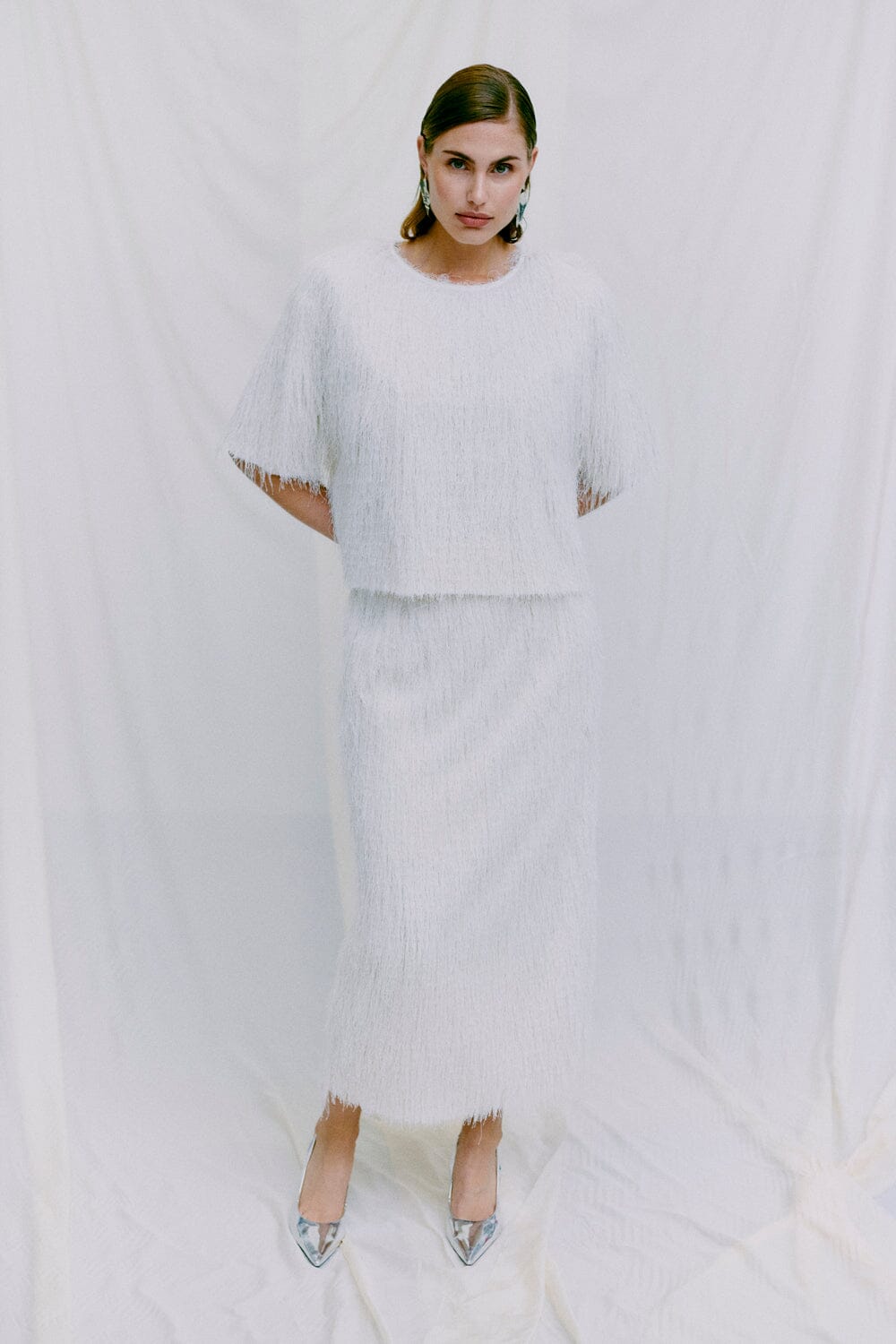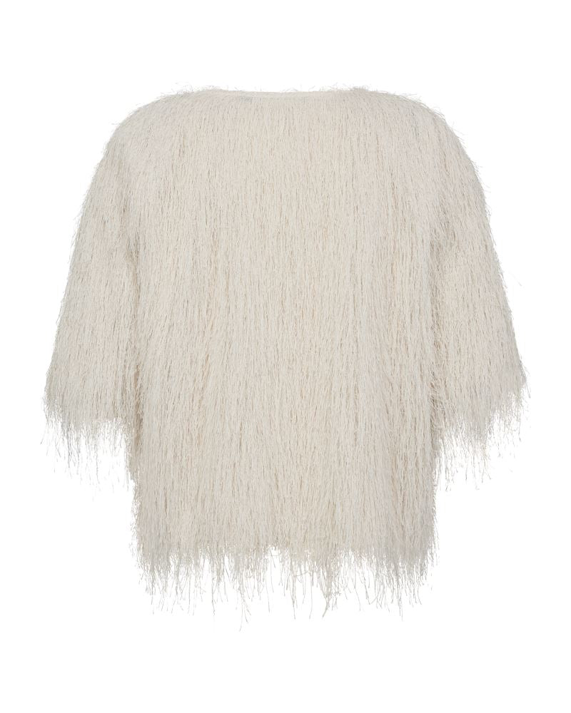 T-shirt fra Copenhagen Muse med frynser i en lys cremefarve. Den har en rund halsudskæring og korte ærmer med en løs pasform, der gør den nem at style.
