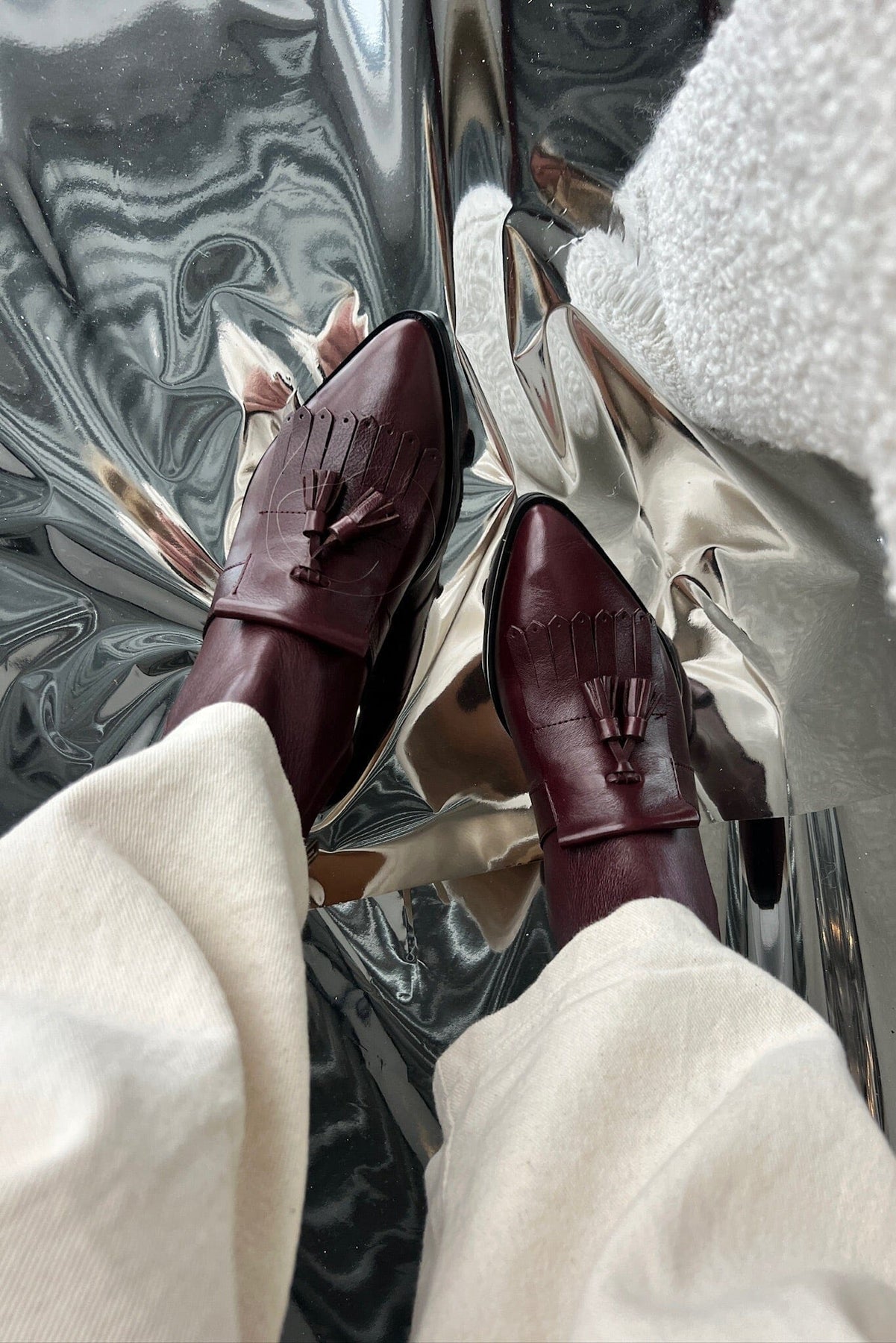 Ankelstøvler fra Copenhagen Shoes, lavet af læder i en varm bordeauxnuance. Støvlerne har kvaster og frynser på vristen, spids tå og praktisk lynlås på indersiden.