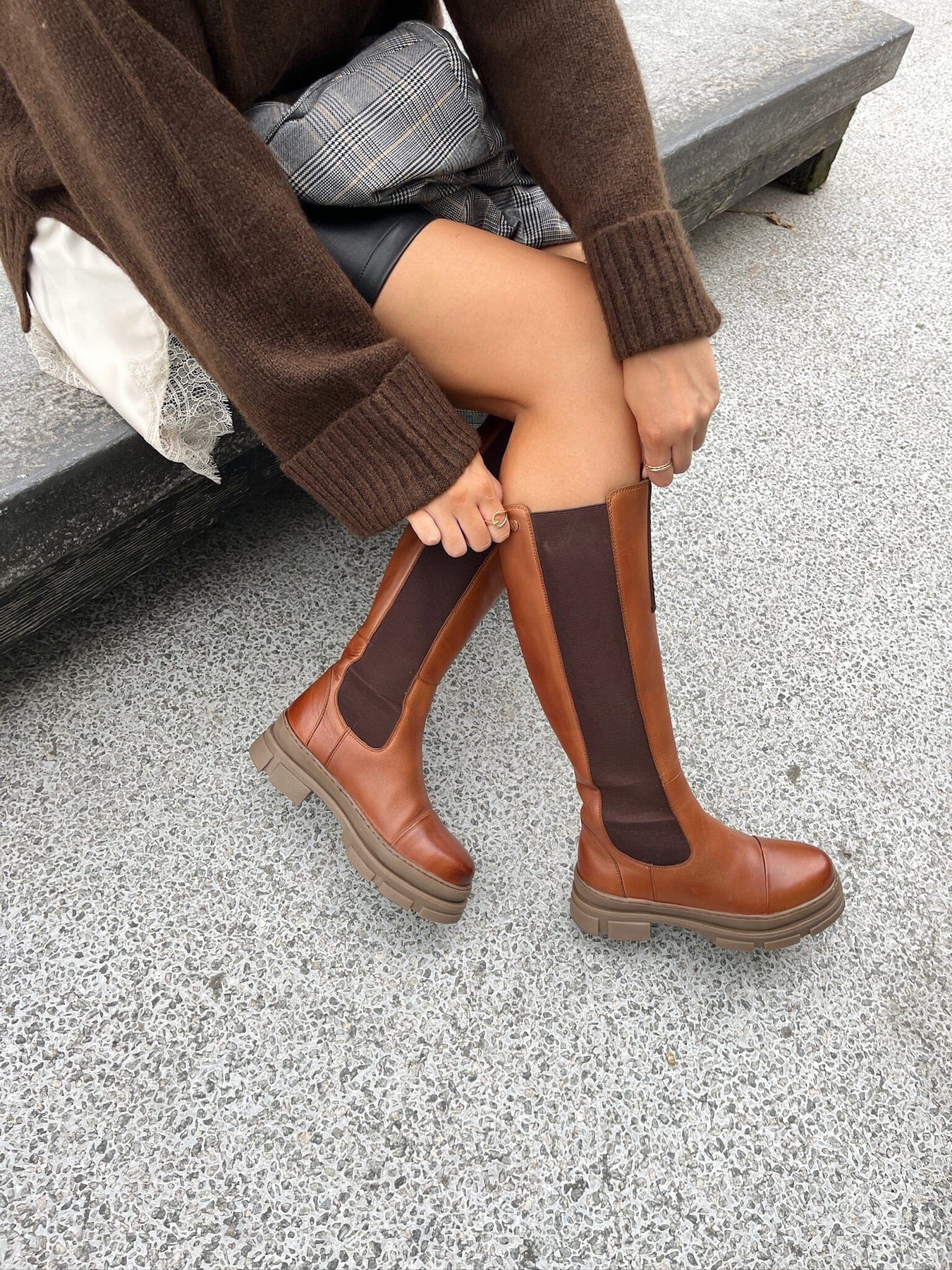 Knæhøje støvler i cognacfarvet læder med mørke elastikpaneler på siderne. TPR-sålen har et chunky design, der giver god støtte til foden.