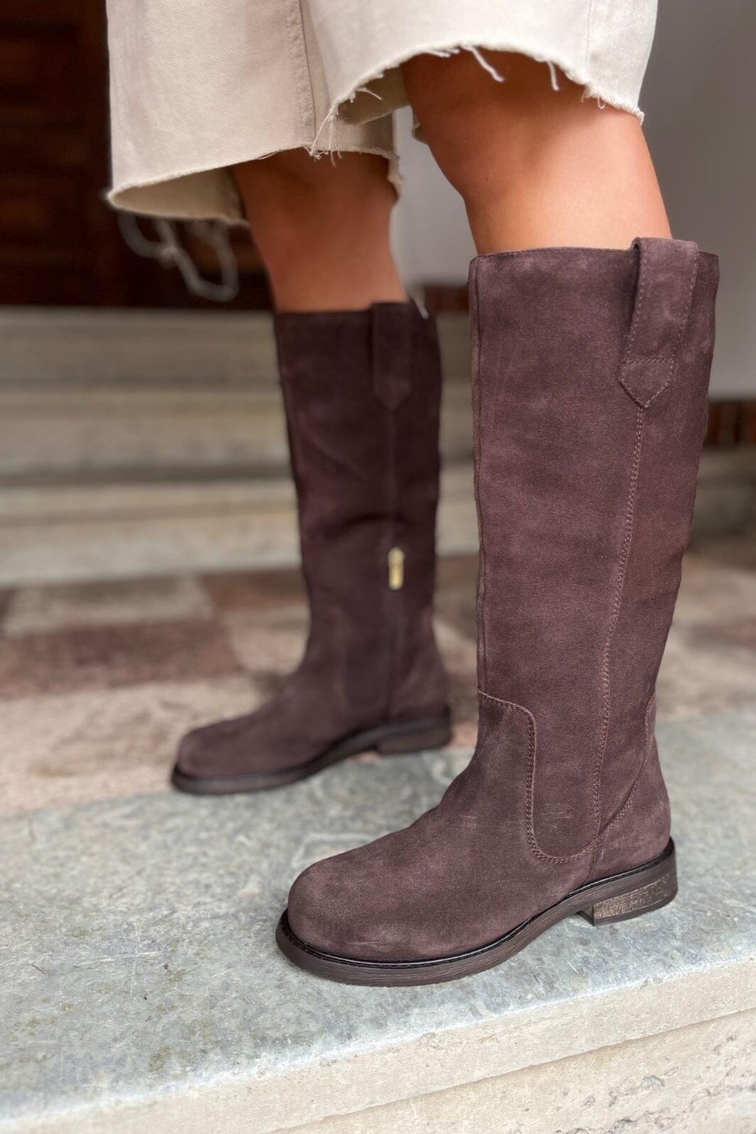 Knæhøj støvle i brun ruskind med rund tå. Støvlen har en lav blokhæl og lynlås i siden. Den brune nuance giver støvlen et rustikt udtryk.