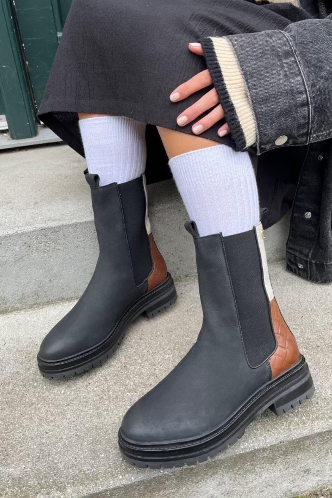 Læderstøvler fra Copenhagen Shoes med sort, brun og beige farvekombination. Støvlerne har en blokhæl og elastisk lukning i siderne.