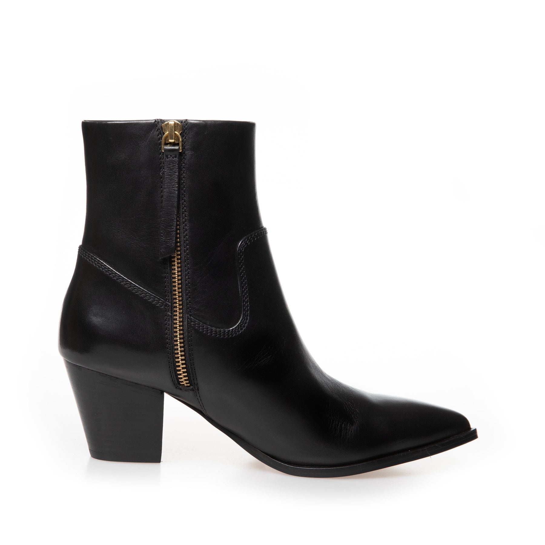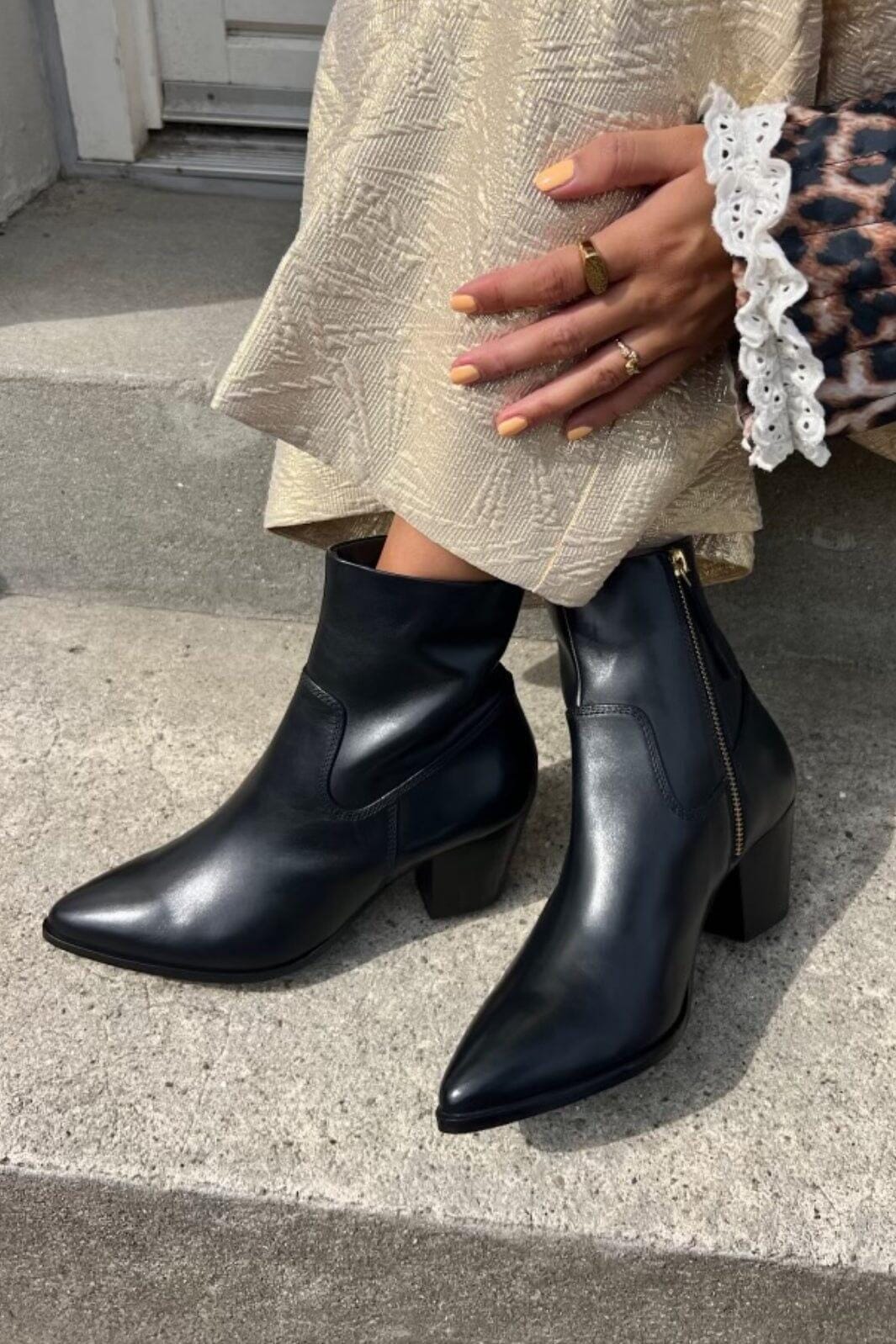 Sort ankelstøvle fra Copenhagen Shoes i læder med spids tå. Støvlen har en blokhæl og lynlås i siden.