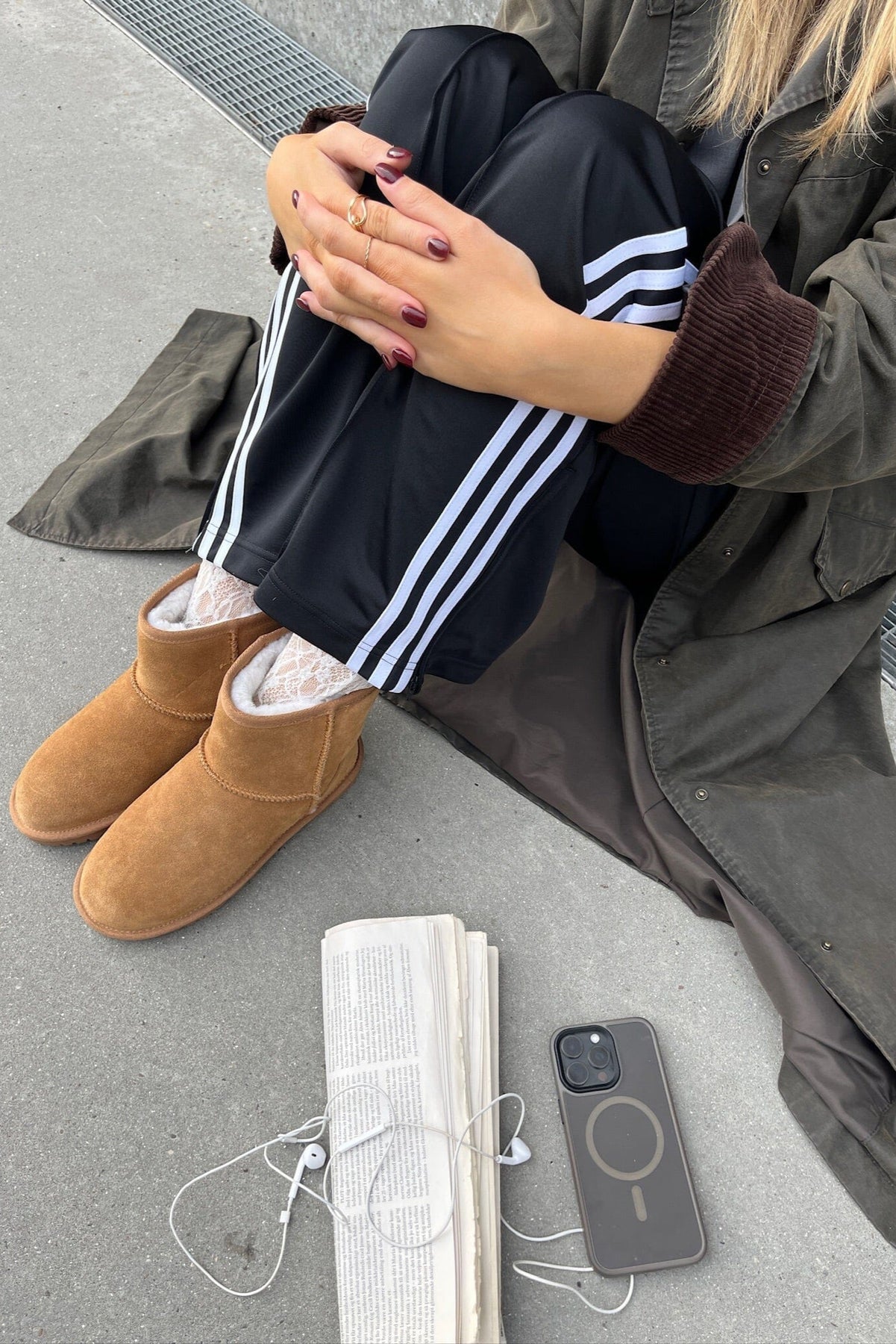 Ankelstøvler i kamelfarvet ruskind og læder fra Copenhagen Shoes. Støvlerne har en blød overflade og et varmt bamsefor, der gør dem ideelle til brug i hjemmet.