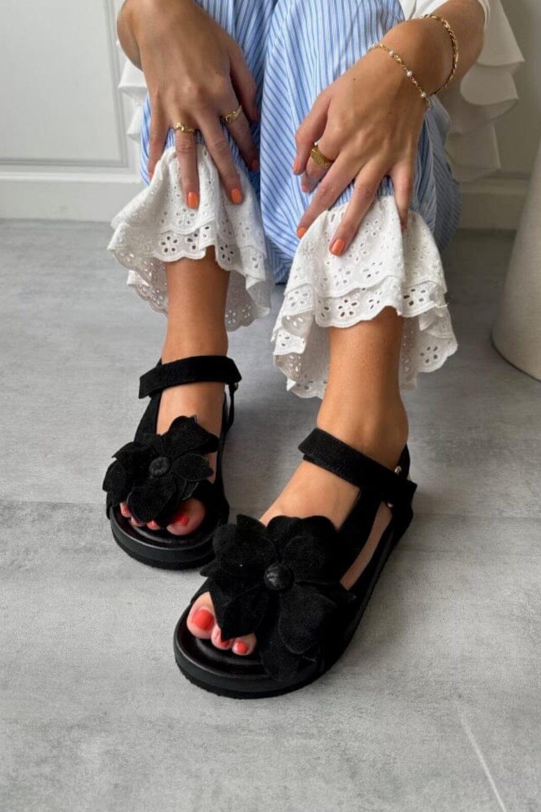 Sorte sandaler fra Copenhagen Shoes med en stor blomsterdetalje på overdelen. Sandalerne er lavet i ruskind og har en åben tå med velcrolukning.