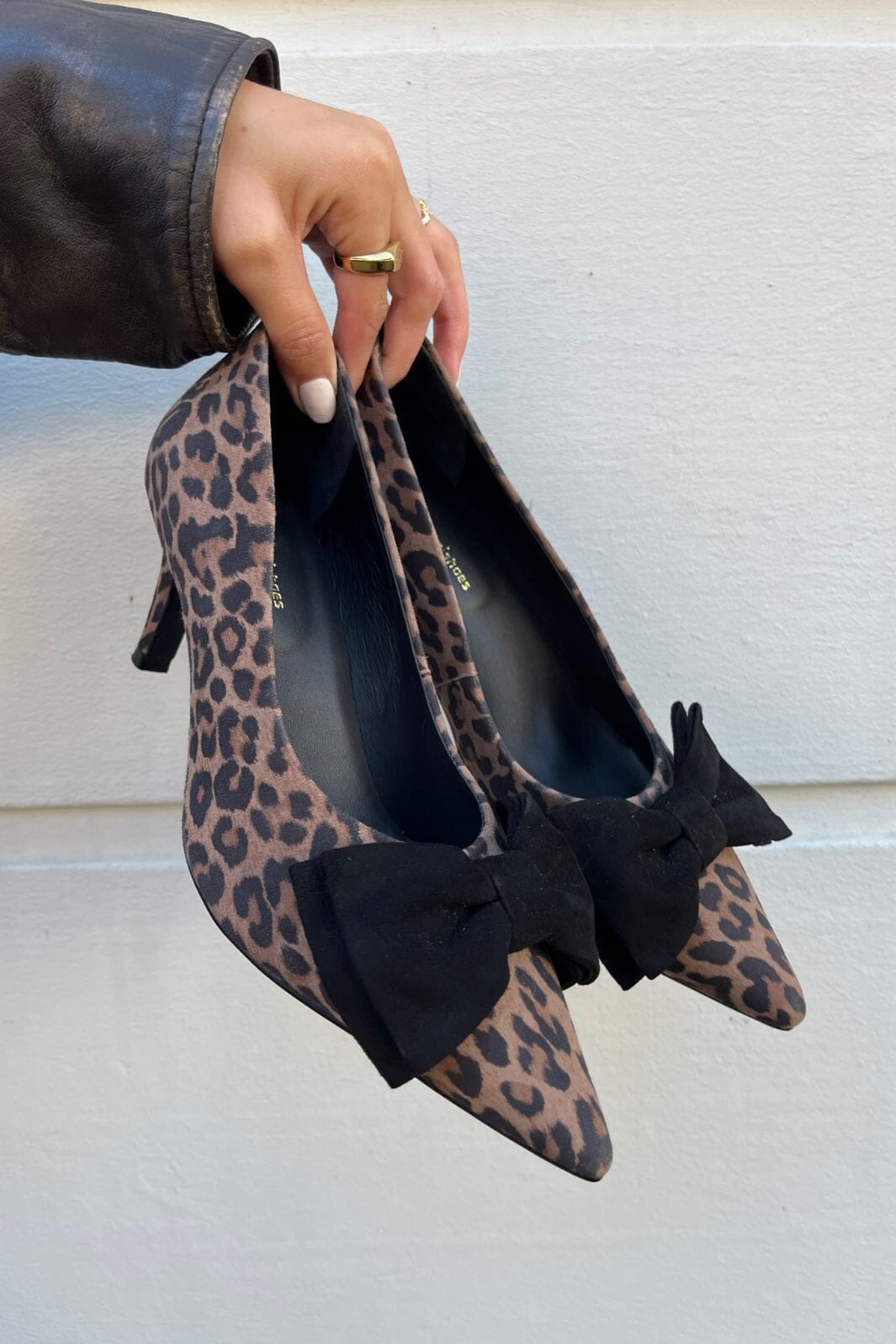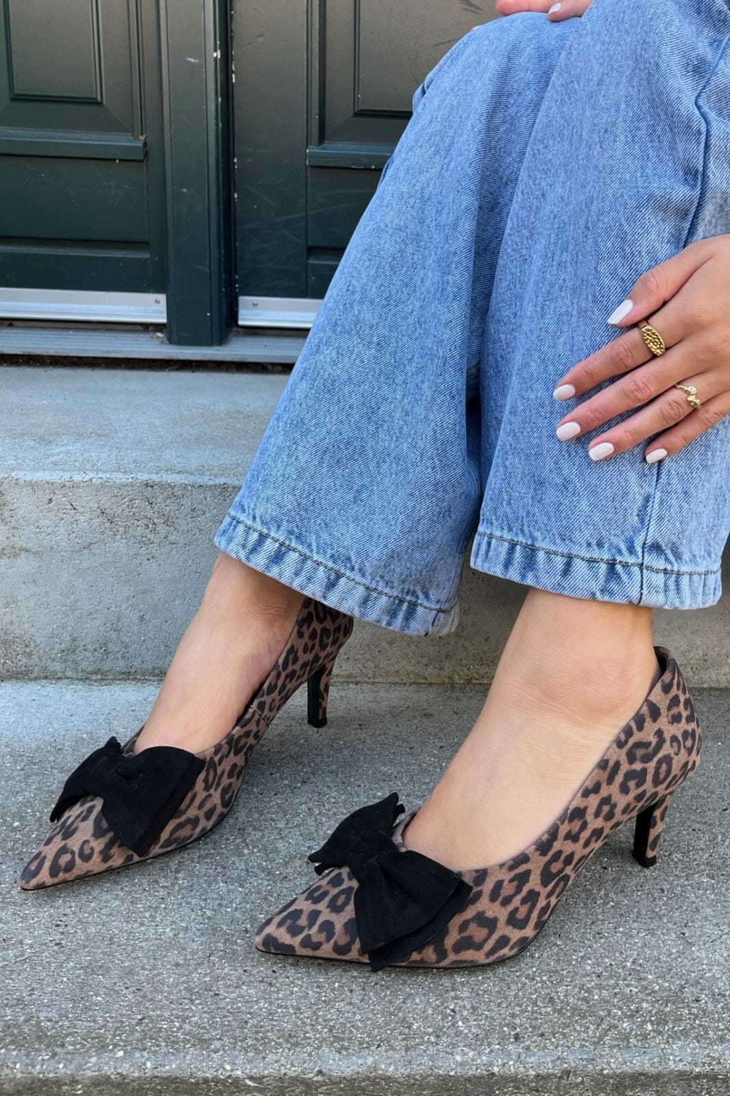 Stiletter fra Copenhagen Shoes i ruskind med leopardprint. Skoene har en spids tå og en sort sløjfe foran, der giver dem et personligt præg.