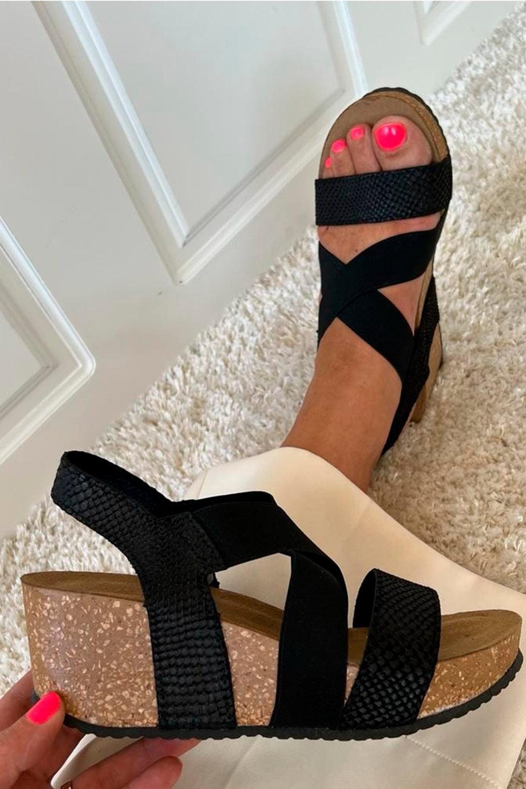 Sort sandal med slangeprint og kilehæl. Sandalen har krydsende elastikremme over vristen og er fremstillet i ægte skind både udvendigt og indvendigt.