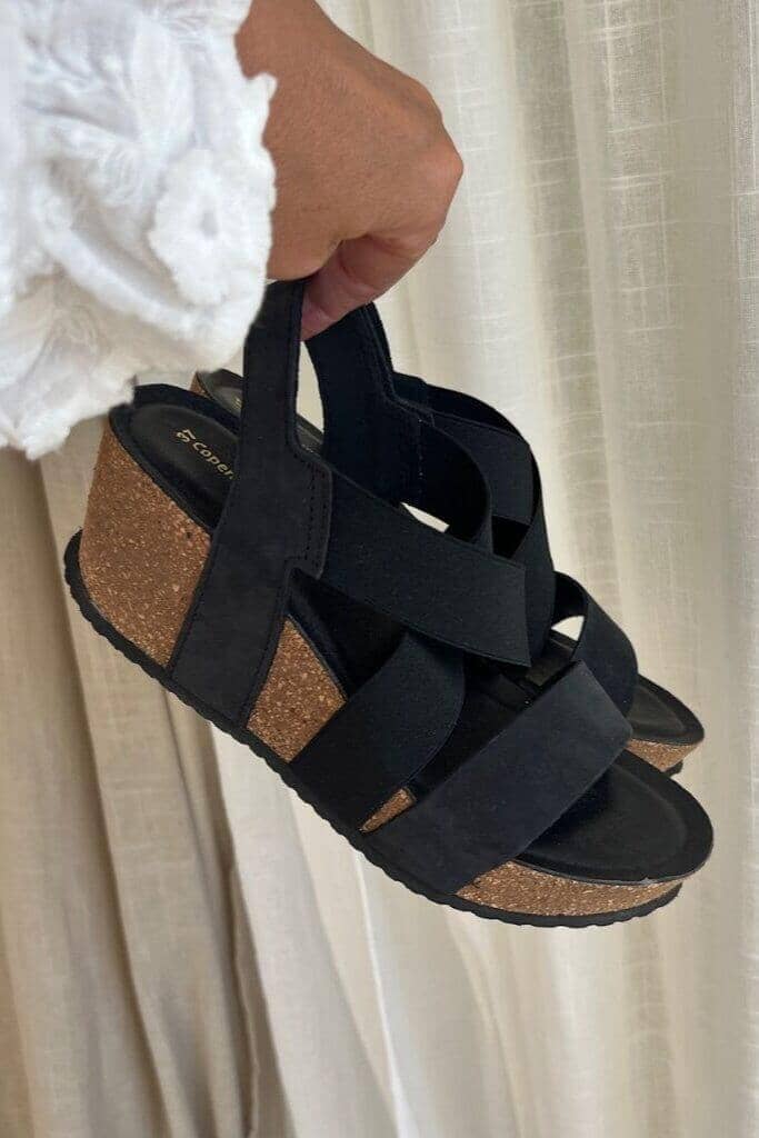 Sort sandal fra Copenhagen Shoes med krydsende remme i nubuck og elastik. Sandalen har en korksål og en specialudviklet skumindersål, der giver god støtte til foden.