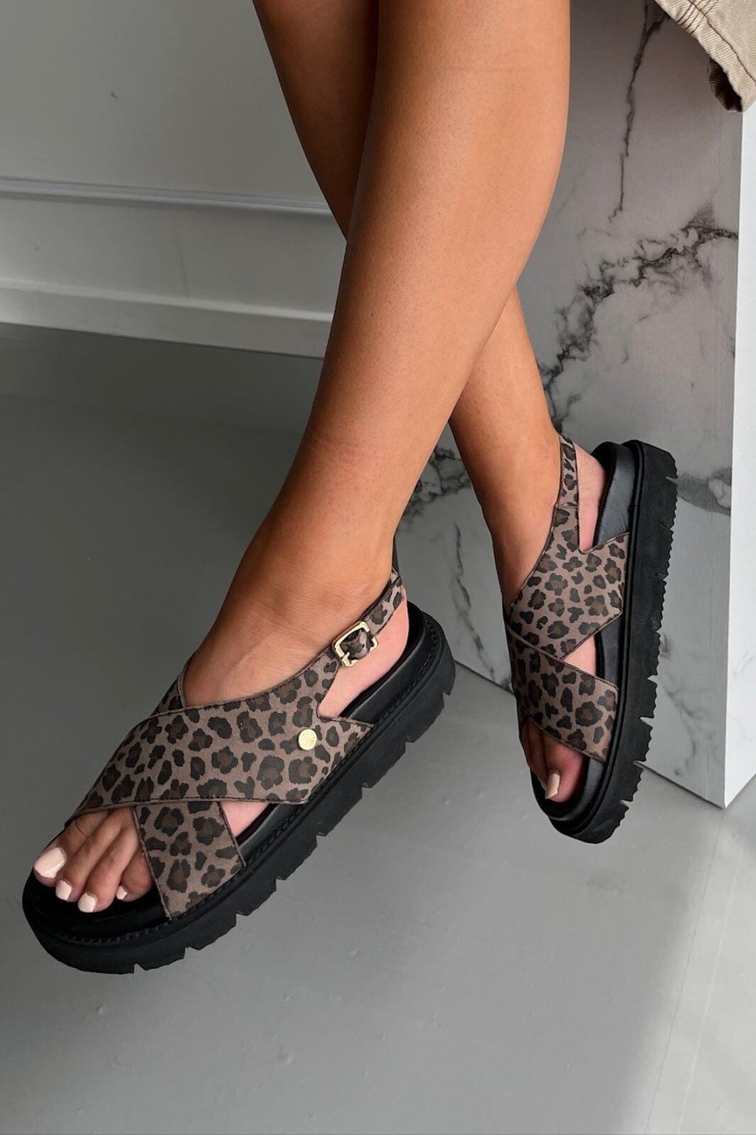 Sandaler fra Copenhagen Shoes i ruskind med sort og brunt leopardmønster. Sandalerne har krydsende remme over foden og en praktisk spænde-lukning ved anklen.
