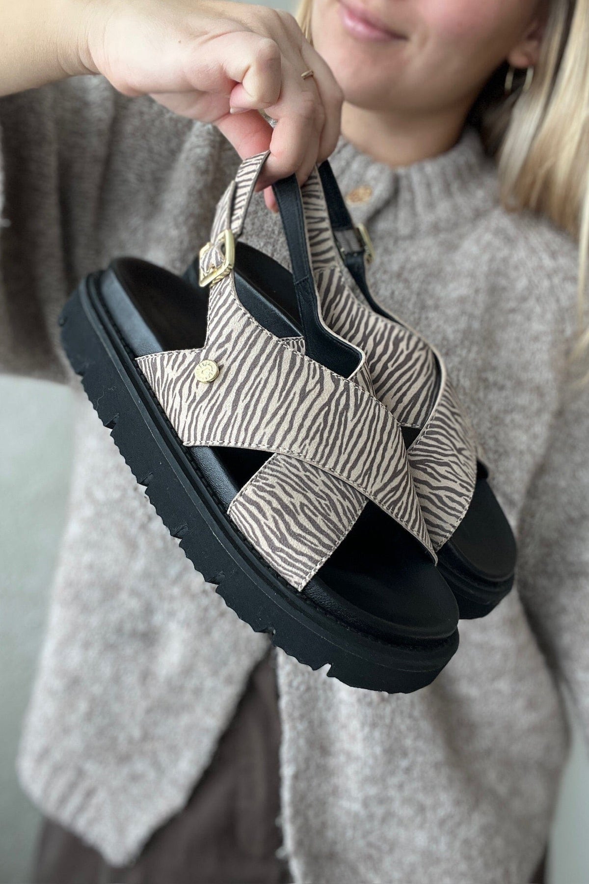 Sandaler fra Copenhagen Shoes, lavet af ruskind i beige og brune nuancer. Sandalerne har et krydsmønstret design med en tyk, sort sål.