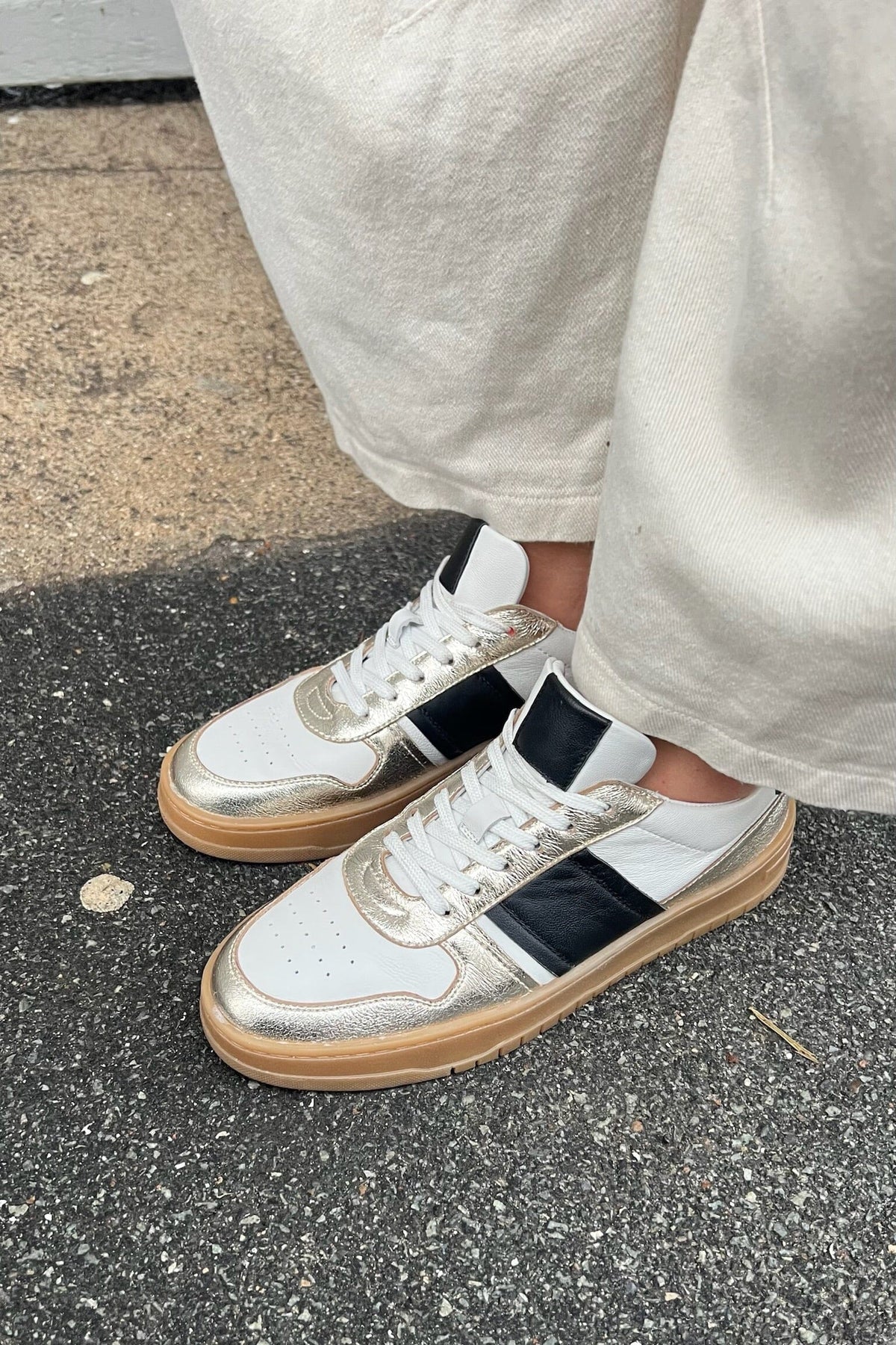 Sneakers fra Copenhagen Shoes i sølvfarvet læder. Skoen har sølv- og hvidfarvede paneler med en sort stribe på siden og en tyk brun sål.