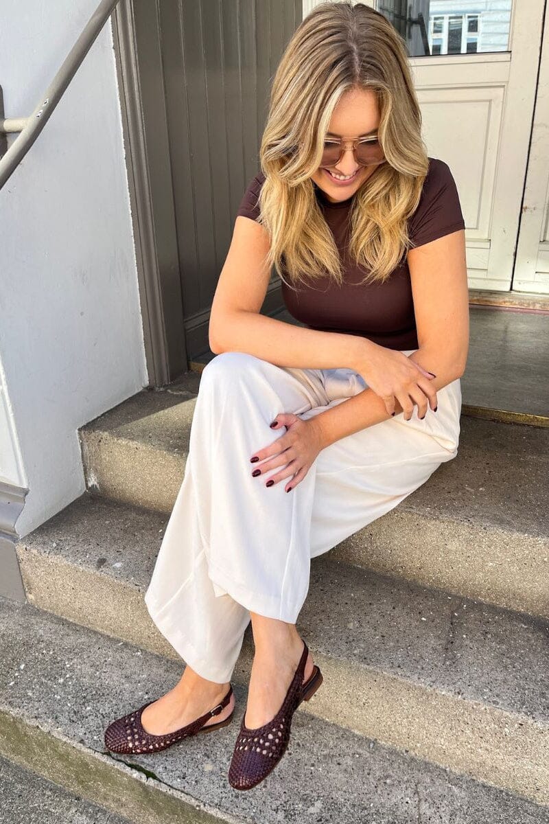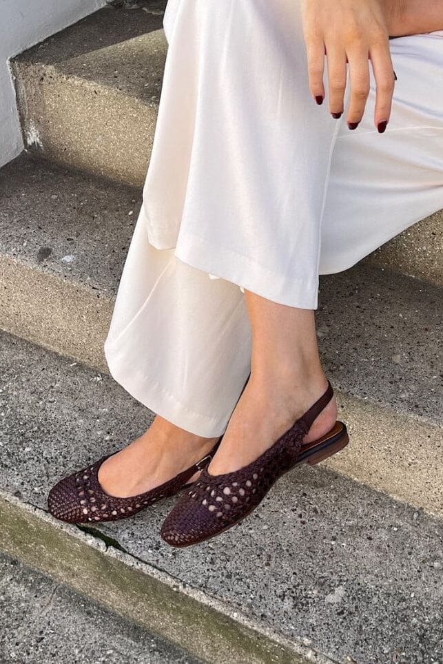 Mørkebrun sko fra Copenhagen Shoes, lavet af læder. Skoen har et flettet design og en justerbar rem med spænde.