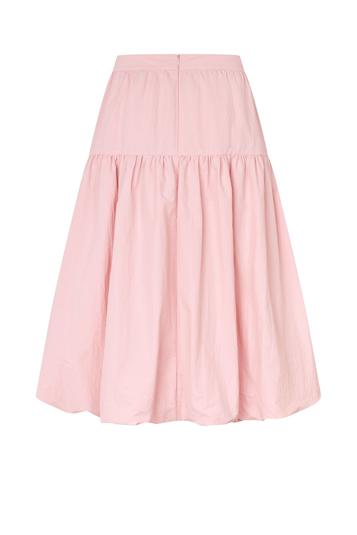Lyserød nederdel fra Cras, lavet af 100 % nylon. Nederdelen har en høj talje og en løs pasform med lagdelte rynker ved sømmene.