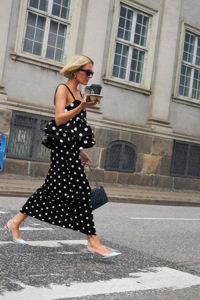 Sort top med store hvide polkaprikker fra Cras. Den firkantede halsudskæring og flæsedetaljerne giver toppen et karakteristisk udtryk. Den sidder løst på kroppen med tynde stropper.