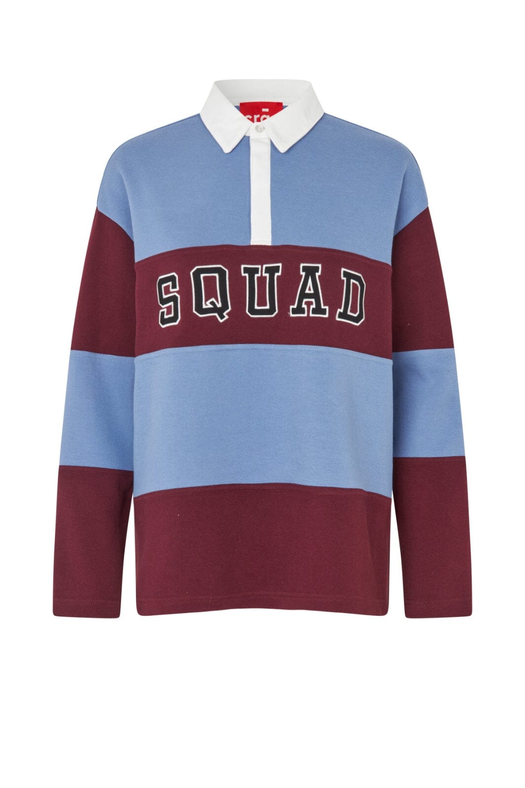Polo-bluse fra Cras med farveblokke i lyseblå og bordeaux. Blusen har SQUAD-print på brystet og en klassisk polo-krave.