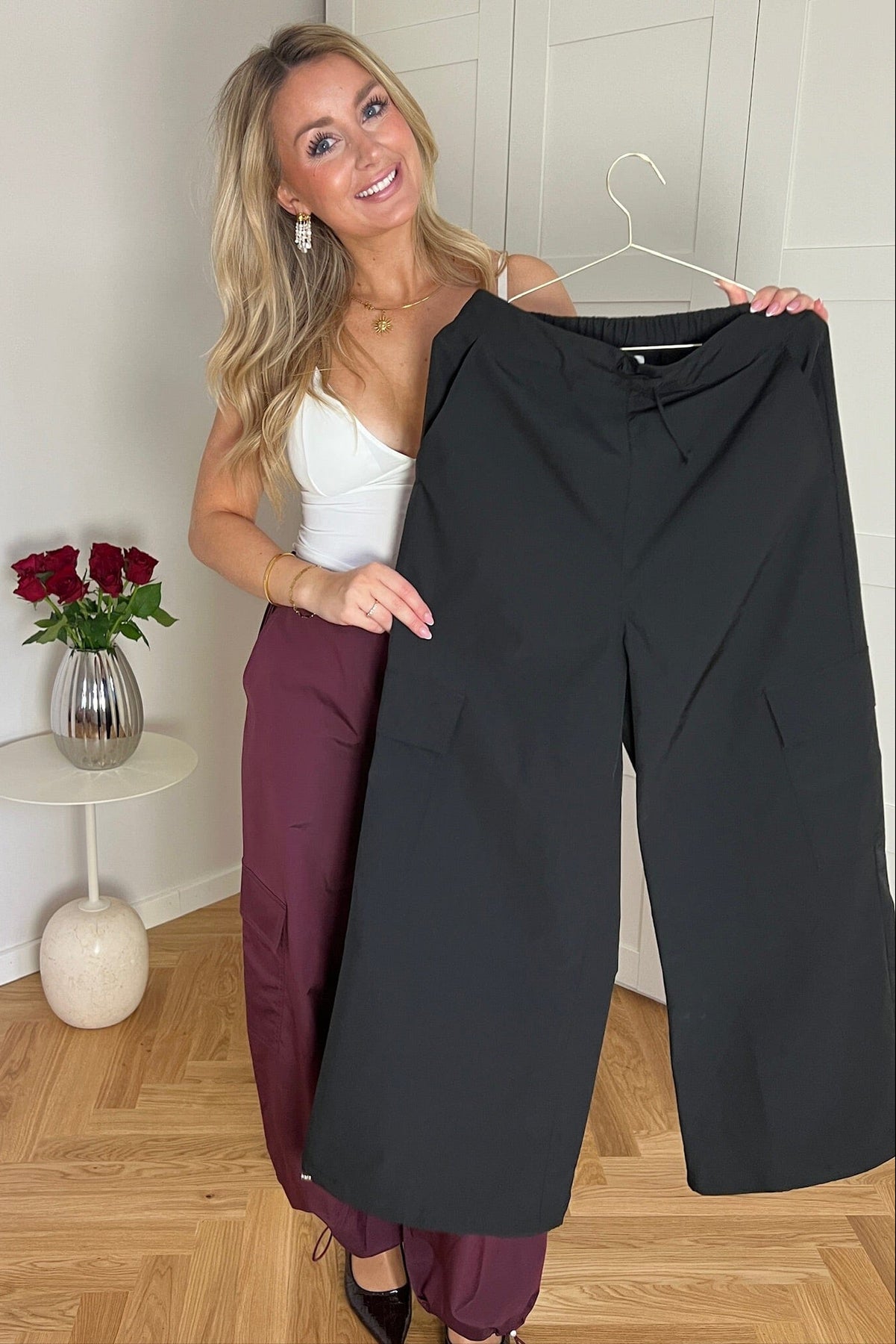 Sorte cargo-bukser fra Dear Molly, lavet af vævet polyester. Bukserne har bindebåndsdetaljer, høj talje og en løs pasform.