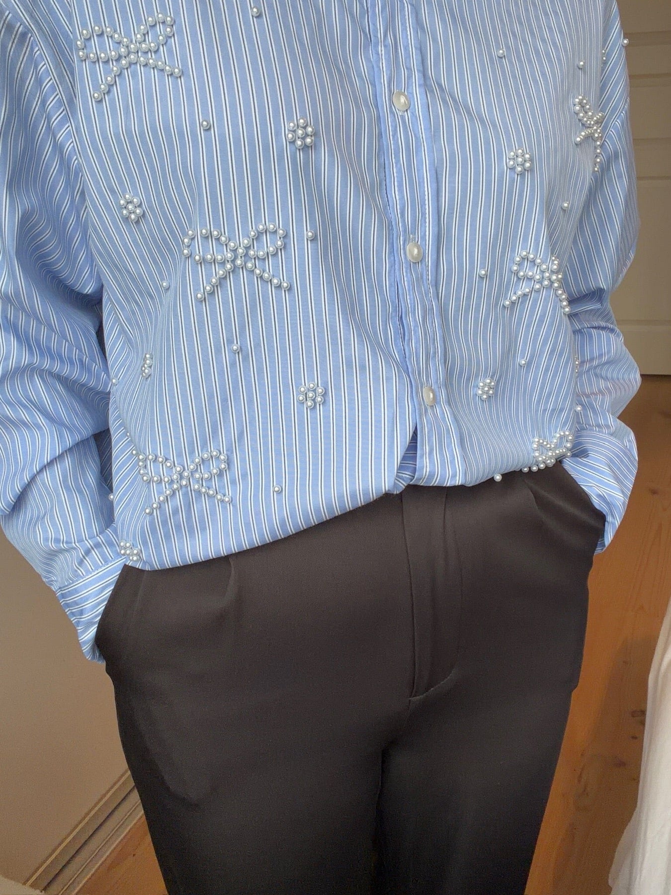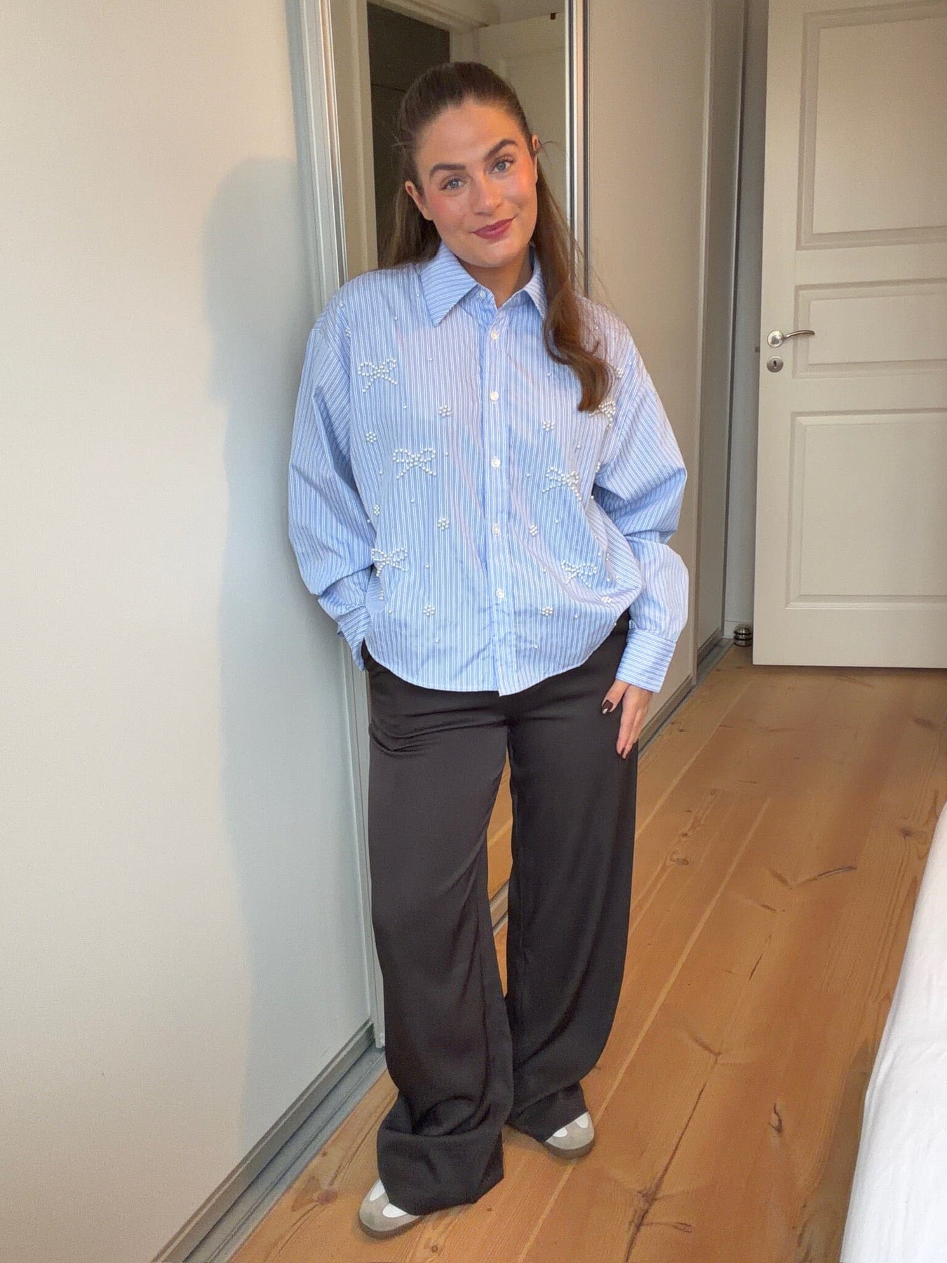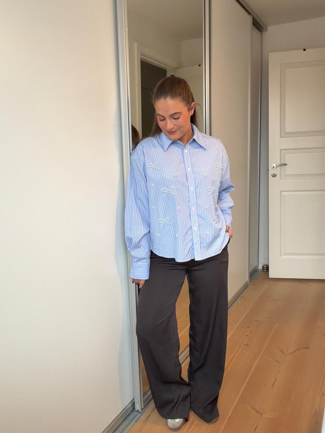 Brune bukser fra Dear Molly med en lang, lige pasform. Bukserne har en høj talje og en løs pasform.