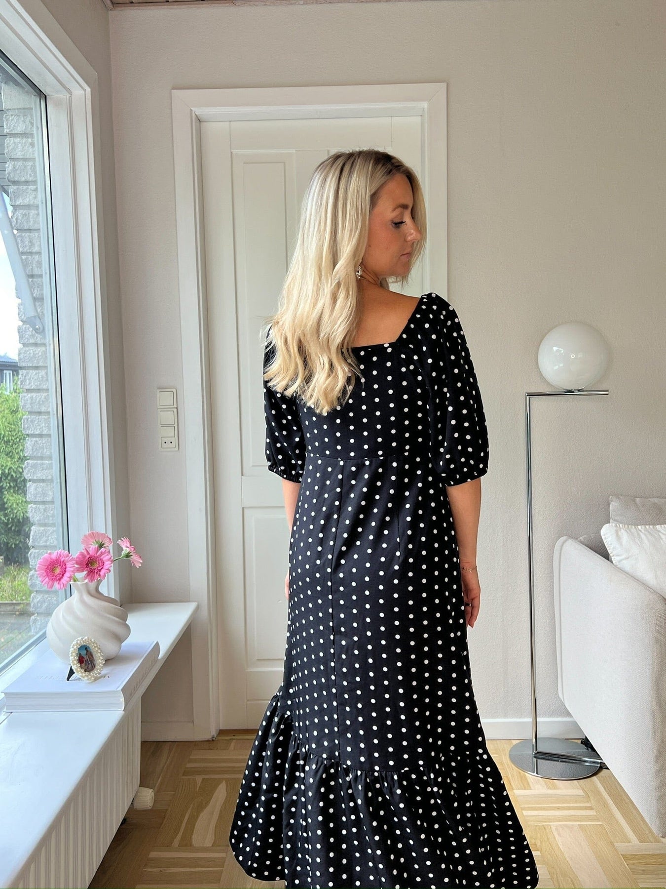Sort ankellang kjole med hvide prikker. Den firkantede halsudskæring og 3/4-ærmer giver kjolen et rent og enkelt udtryk. Flæsekanten i bunden skaber bevægelse i den løse pasform.