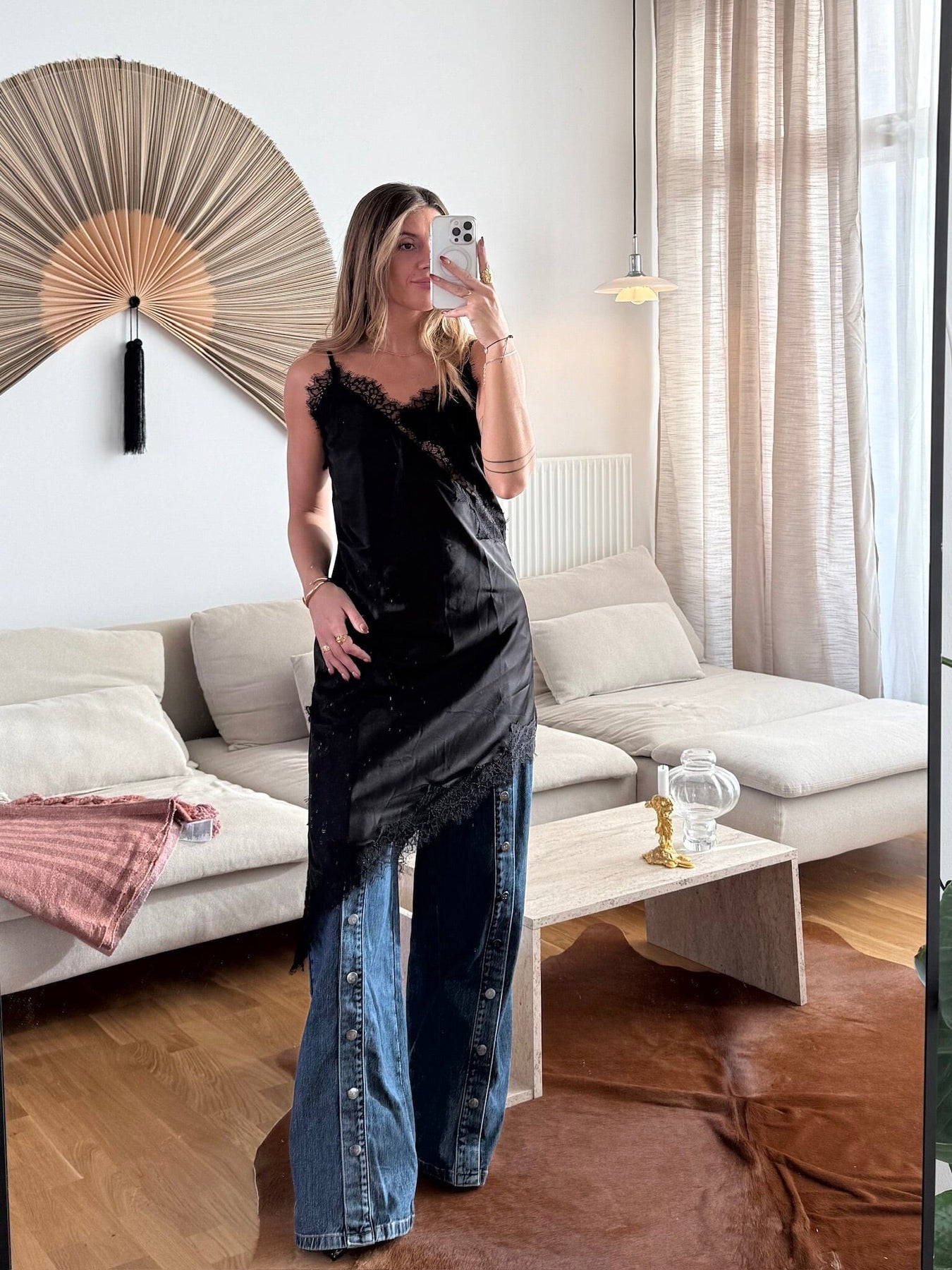 Sort knælang kjole fra Dear Molly, lavet af vævet materiale. Kjolen er designet til festlige begivenheder med blonder ved halsudskæringen og nederst.