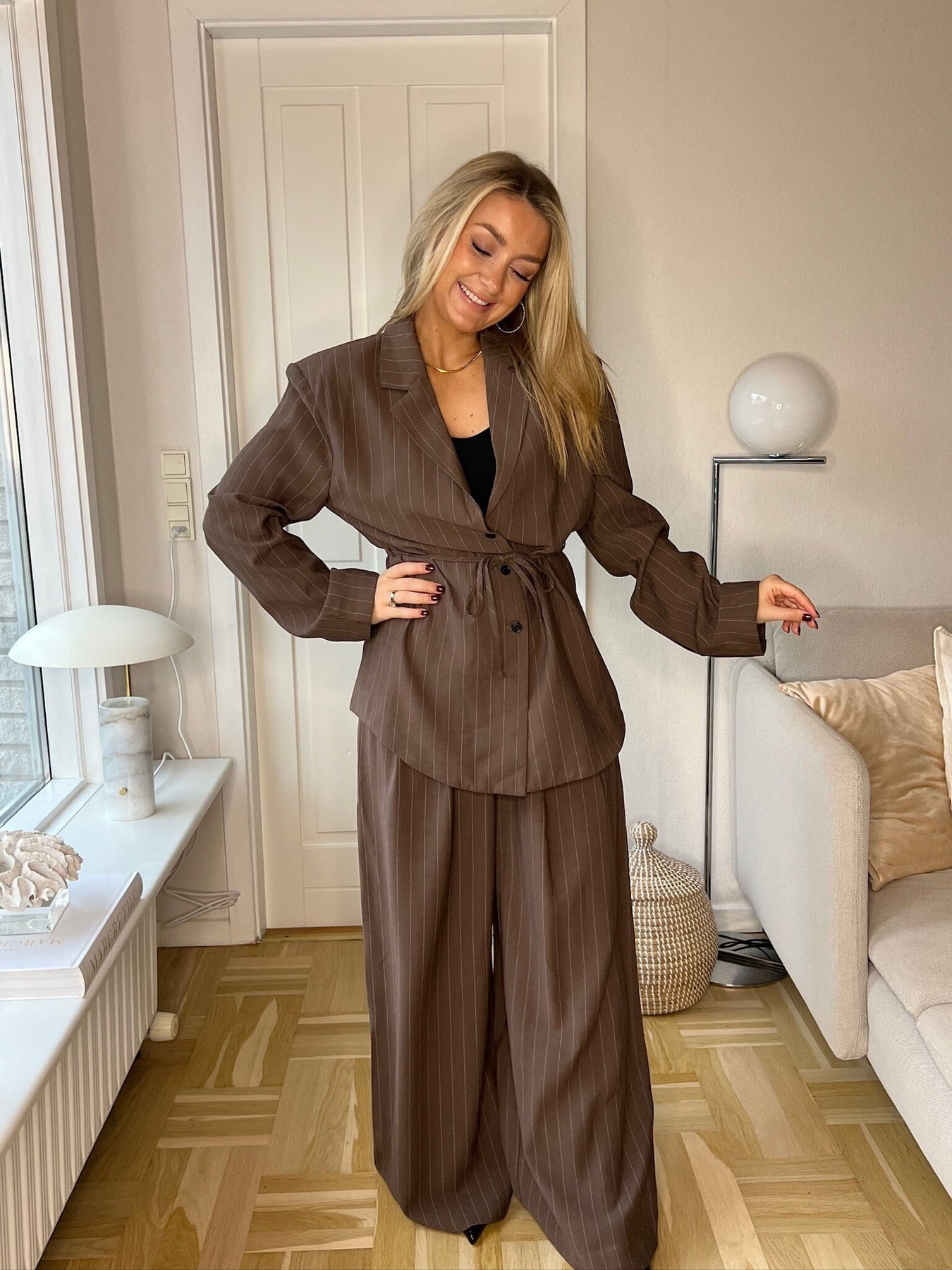 Brun blazer fra Dear Molly med nålestriber. Blazeren er lavet af vævet materiale og har en oversized pasform med V-hals og bindebånd i taljen.