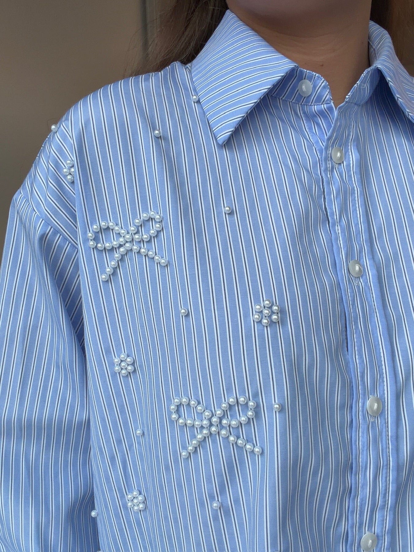 Skjorte fra Dear Molly i lyseblå med hvide striber. Perlesløjferne er placeret over hele skjorten og giver den et dekorativt udtryk. Den passer til både formelle og afslappede situationer.