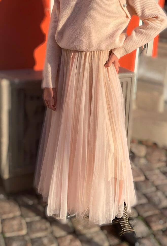 Super flot tyl nederdel fra EMM Copenhagen i flot peach/nude farve. Nederdelen har elastik i taljen samt fint bånd foran som kan bindes til sløjfe. Der er inderskørt.