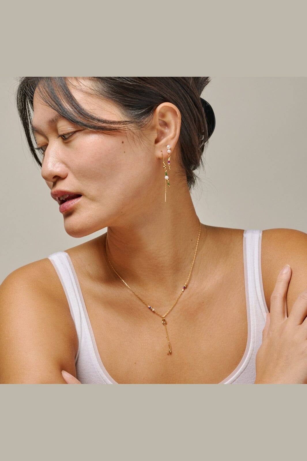 Øreringe fra Enamel Copenhagen, lavet af 18K guldbelagt genanvendt sterlingsølv. De lange kæder er dekoreret med organiske guldelementer, hvide ferskvandsperler og grønne Miyuki-perler.