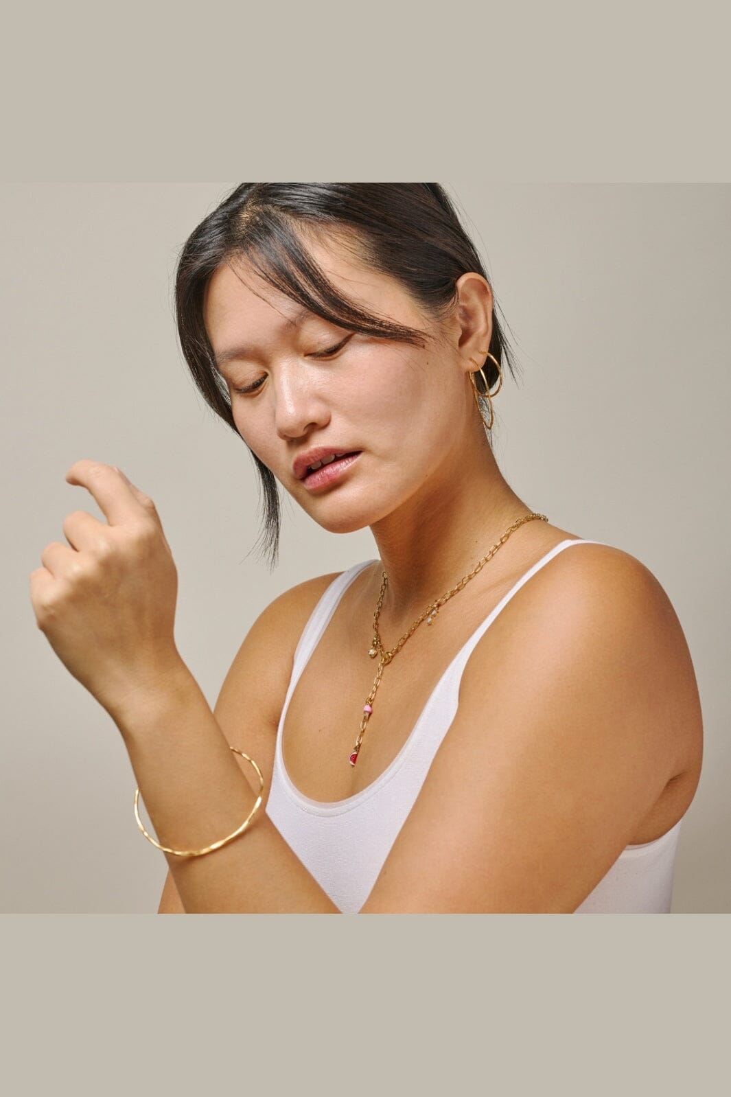 Hoops fra Enamel Copenhagen med en organisk og ujævn overflade. Øreringene er guldfarvede og har en cirkulær form med et levende lysespil.