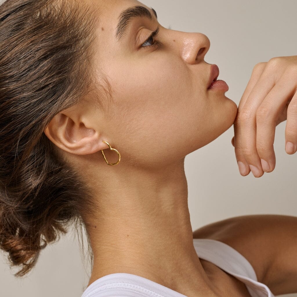 Hjerteformede øreringe fra Enamel Copenhagen. Håndlavede hoops i guldbelagt genbrugssterlingsølv med en struktureret overflade og organisk form.