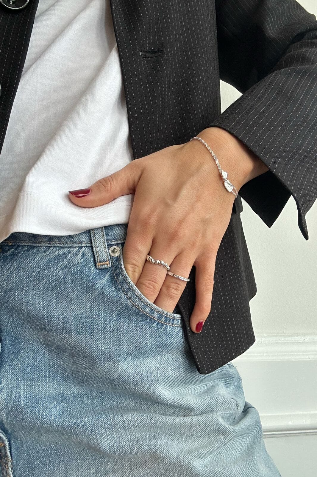 Ring fra Enamel Copenhagen, lavet af genanvendt sterling sølv. Ringen har et design med kugleformede segmenter i en sølvfarvet nuance.