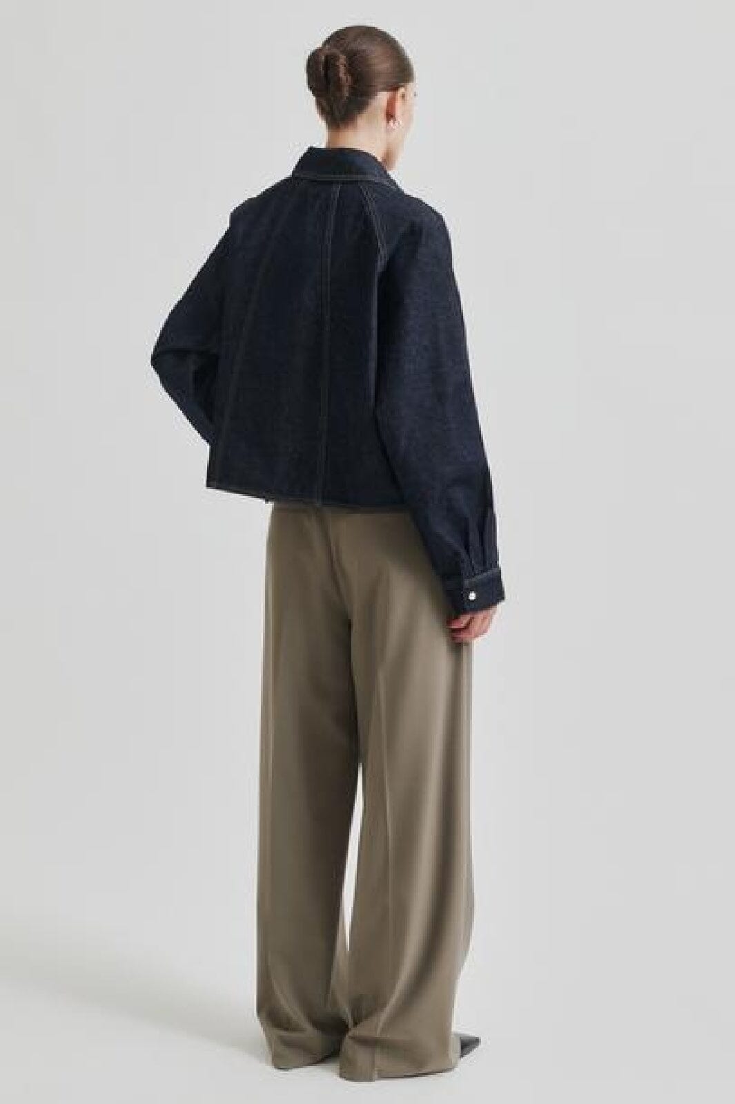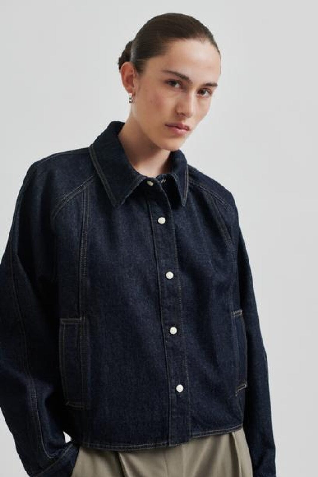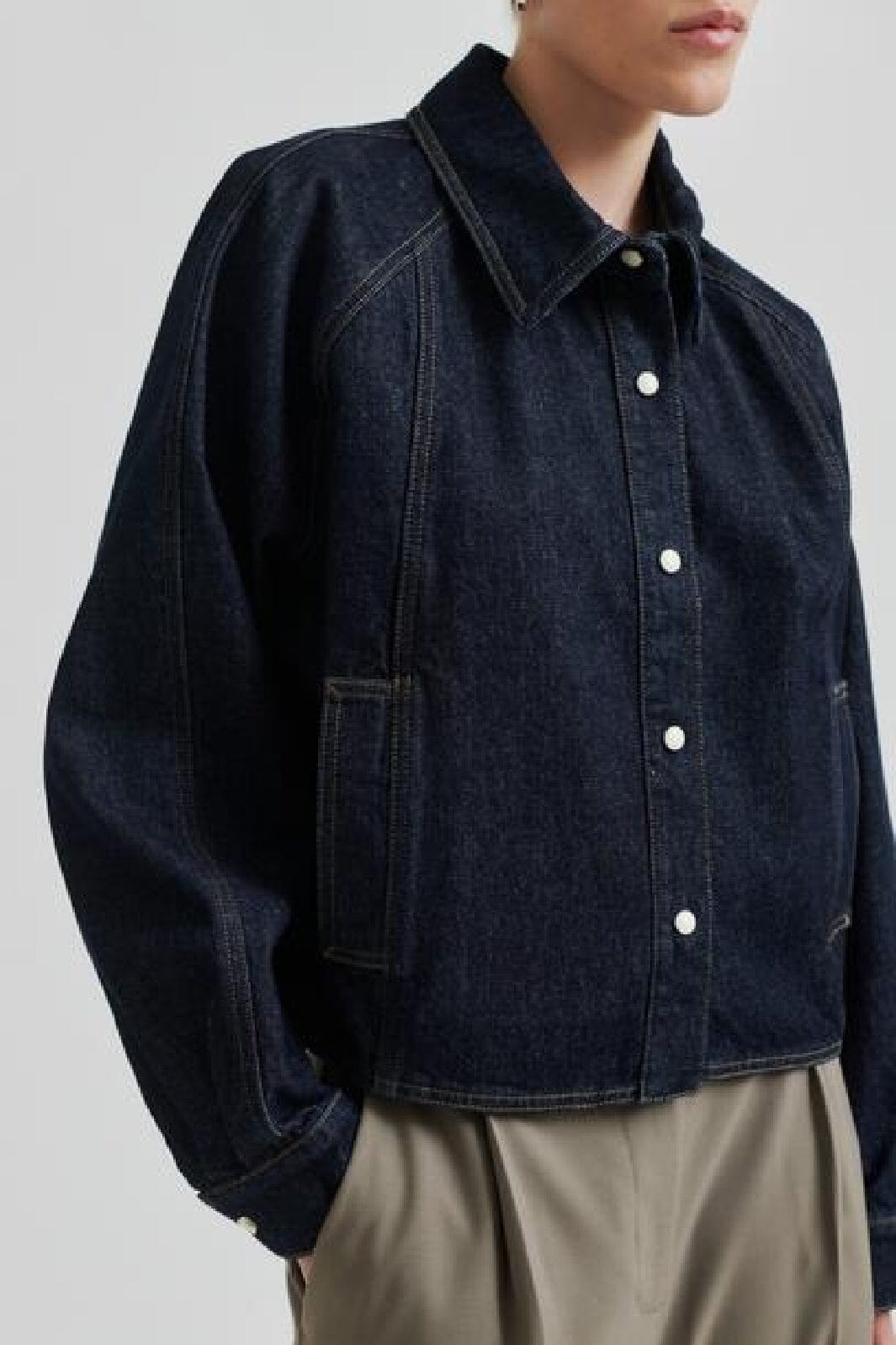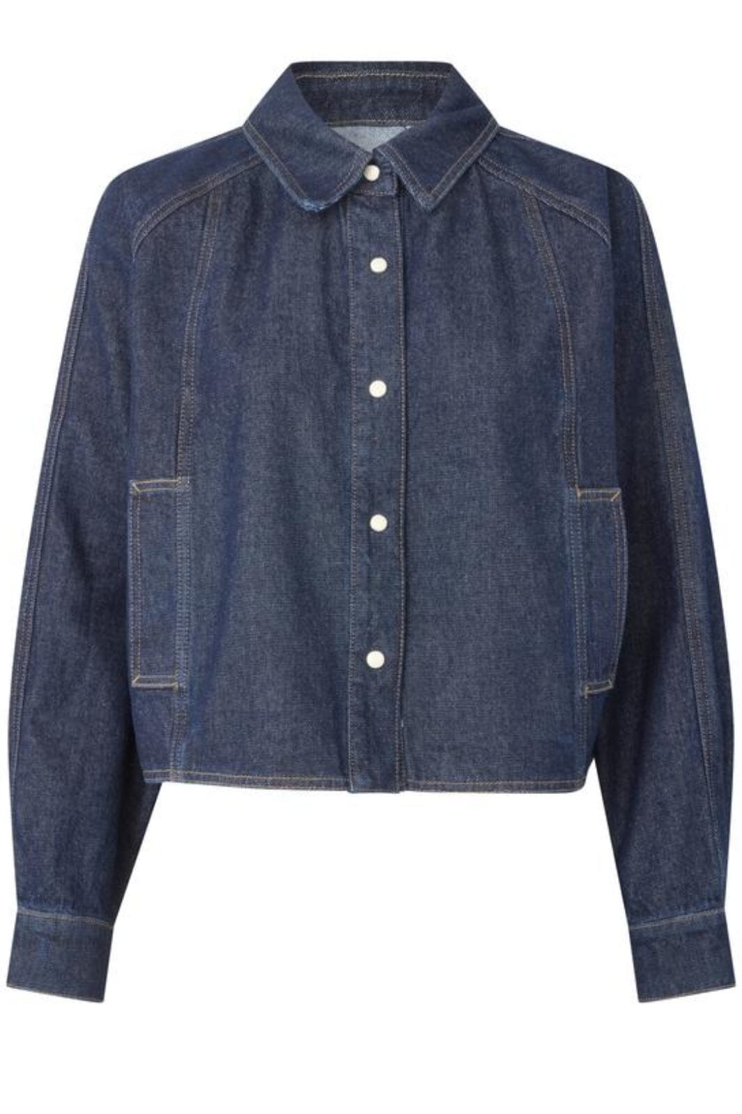 Denimskjorte fra Second Female i mørkeblå denim. Skjorten har hvide knapper, sidelommer og let puffede ærmer. Den klassiske krave og synlige syninger giver skjorten et håndværksmæssigt udtryk.