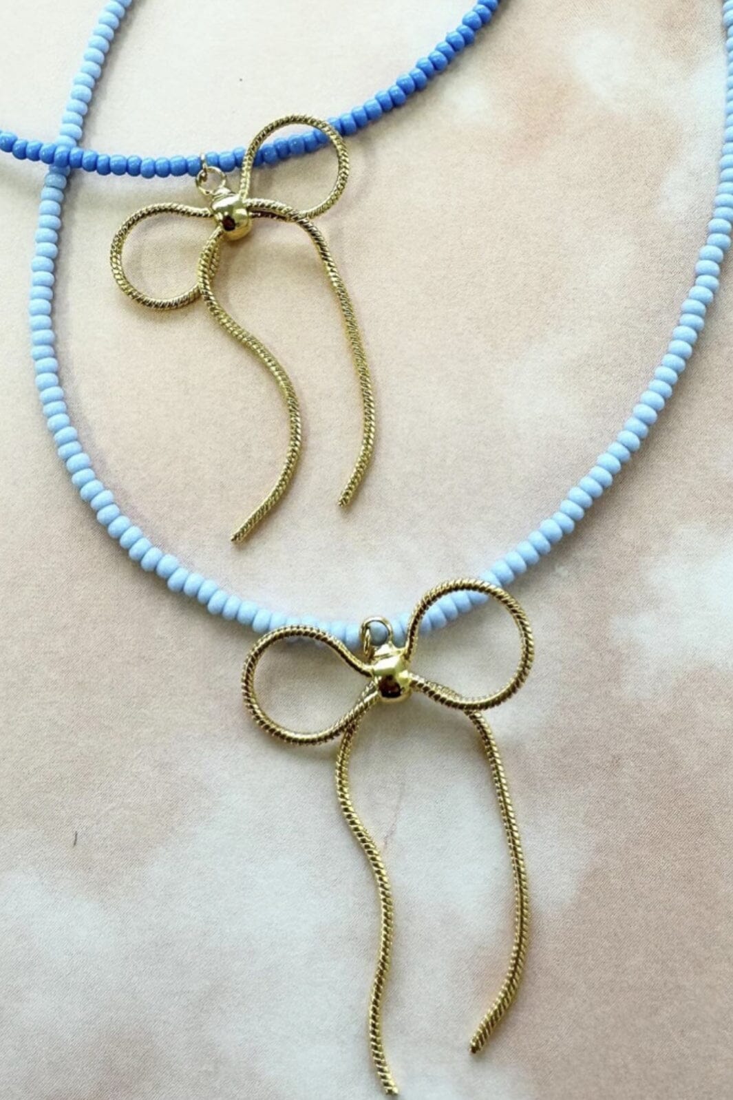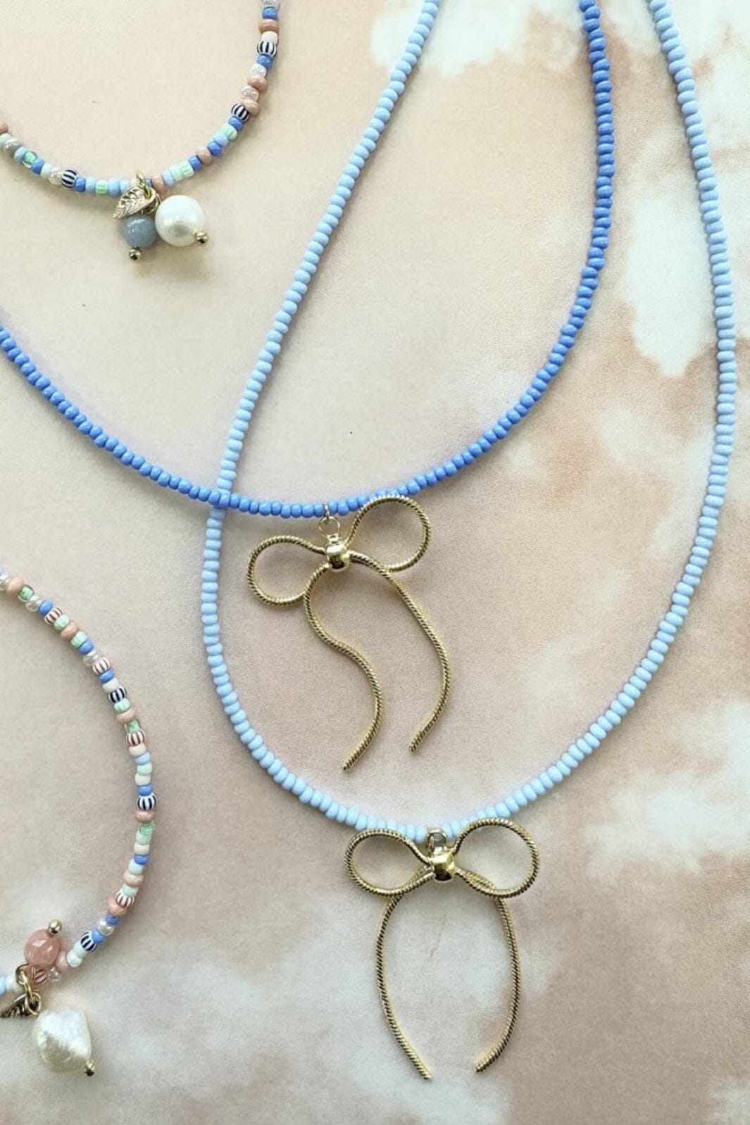 En halskæde med sløjfeformet vedhæng i guldfarvet metal. De lyseblå perler går hele vejen rundt om kæden og skaber en fin kontrast.