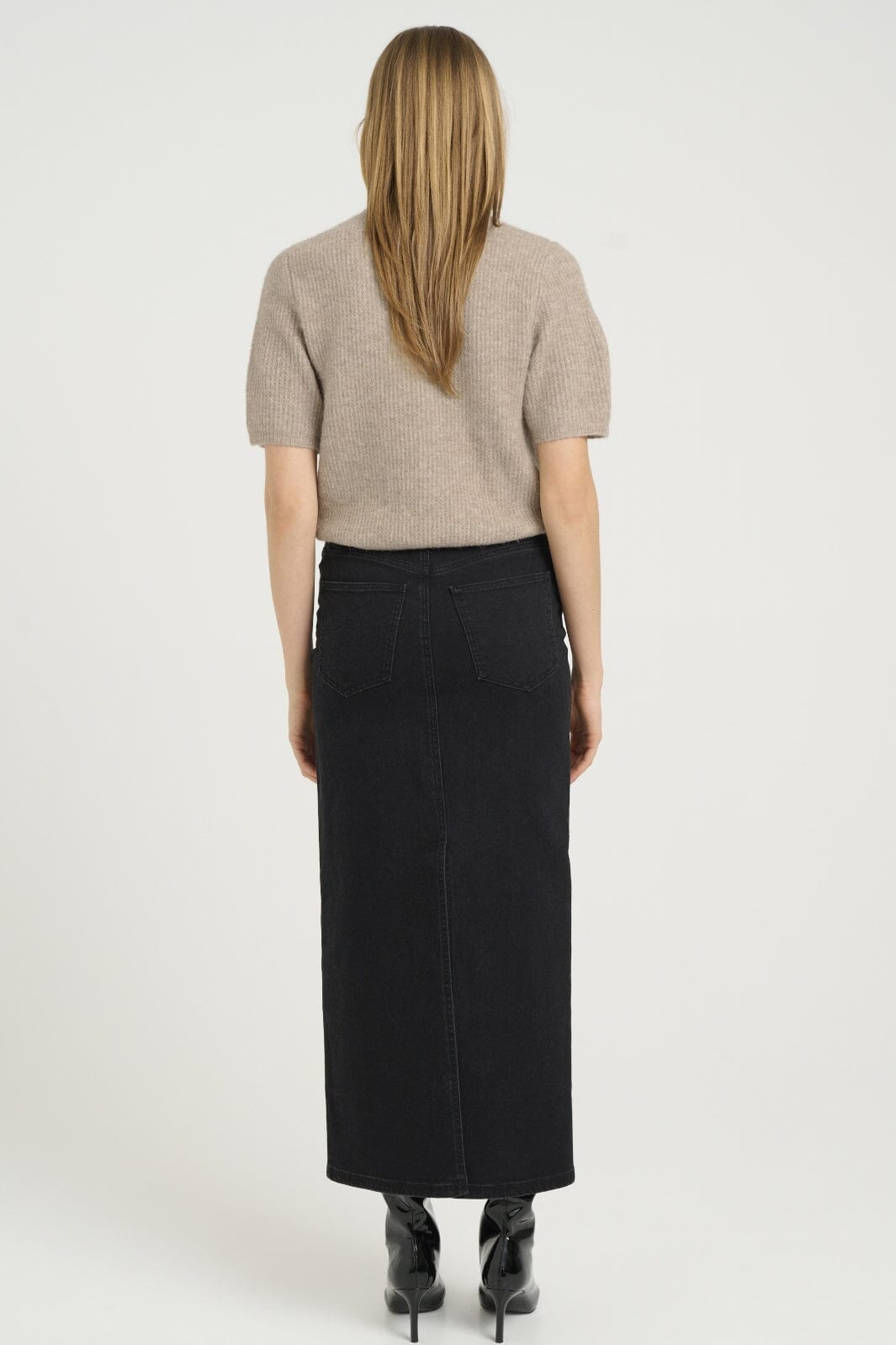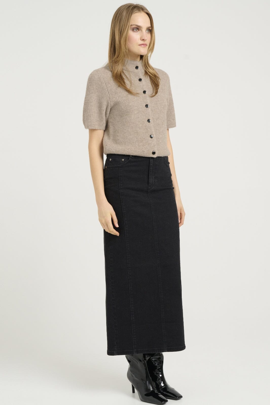 Kort cardigan fra Gestuz i varm sandfarvet melange. Den har høj hals og korte ærmer med en række sorte knapper ned foran. Strikken har en blød tekstur og regular fit.