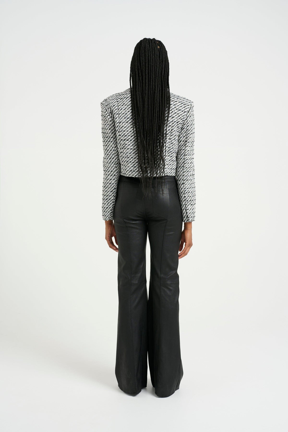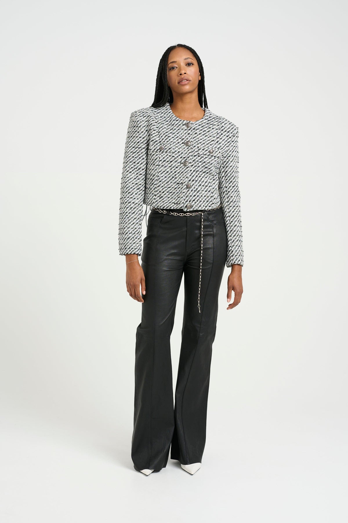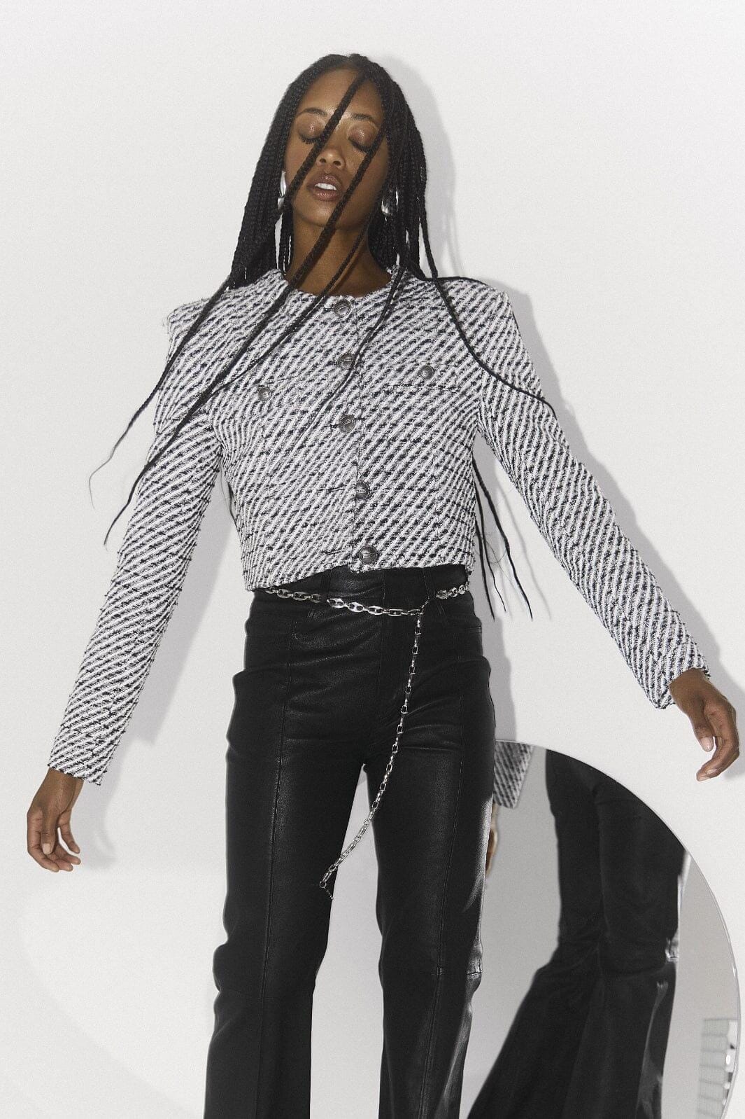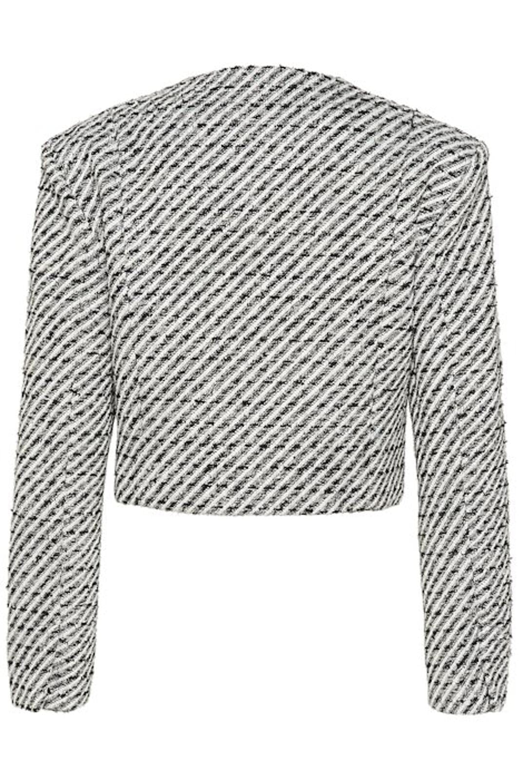 Sort-hvid cropped jakke fra Gestuz med strukturerede skuldre og striber i lurex twill. Jakken har en kort længde og knapper foran.