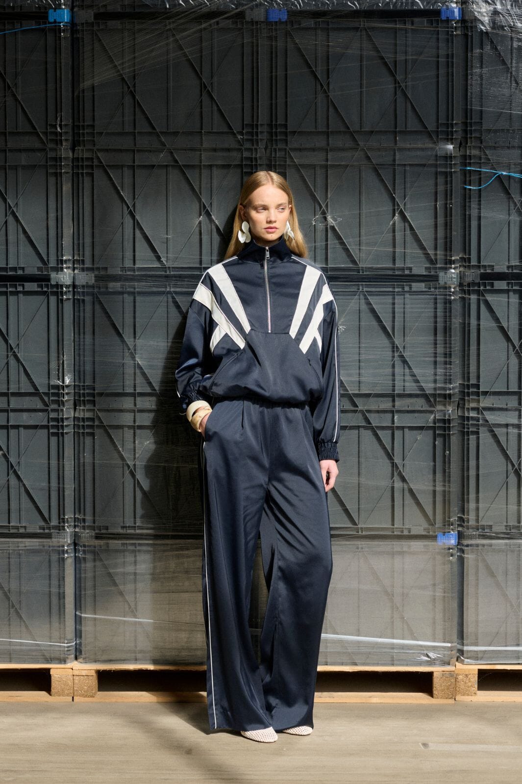 Anorak fra Gestuz i mørkeblå med hvide grafiske striber. Den har høj hals, halv lynlås og elastiske manchetter.