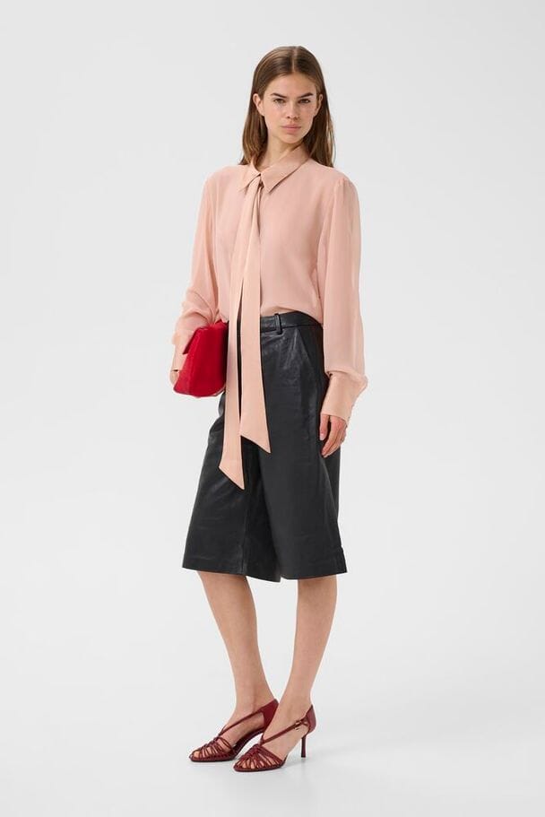 Skjorte fra Gestuz i en lys beige-pink nuance. Skjorten har bindebånd i taljen, klassisk skjortekrave med knapper og lange ærmer.