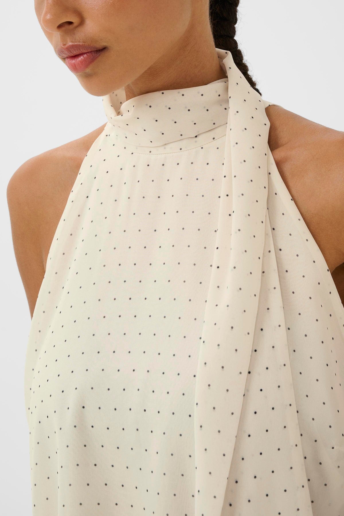 En ærmeløs top fra Gestuz med et prikket mønster i creme- og hvide nuancer. Toppen har en høj halsudskæring og sløjfedetaljer på bagsiden.