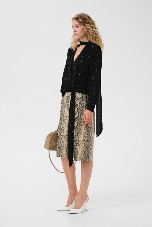 Bluse fra Gestuz i mørk khaki med små lyse prikker. Blusen er lavet af 100 % genanvendt polyester og har bindebåndsdetaljer.