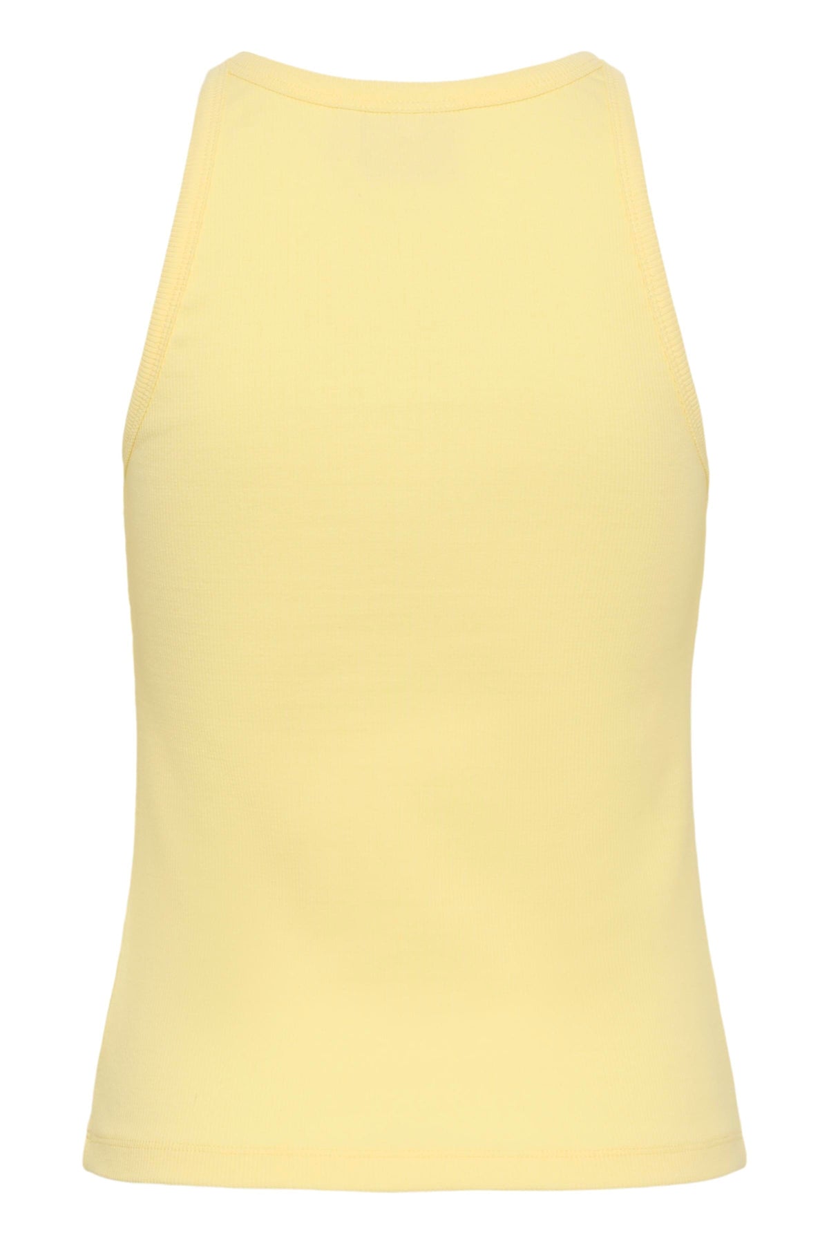 Lysegul tanktop fra Gestuz, lavet af 94 % bomuld og 6 % elastan. Toppen har et tætsiddende design med rund halsudskæring og et lille broderet logo.